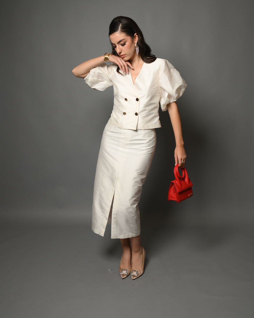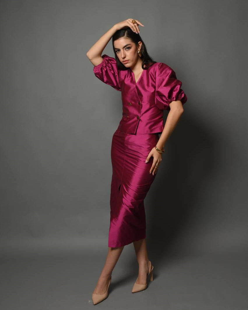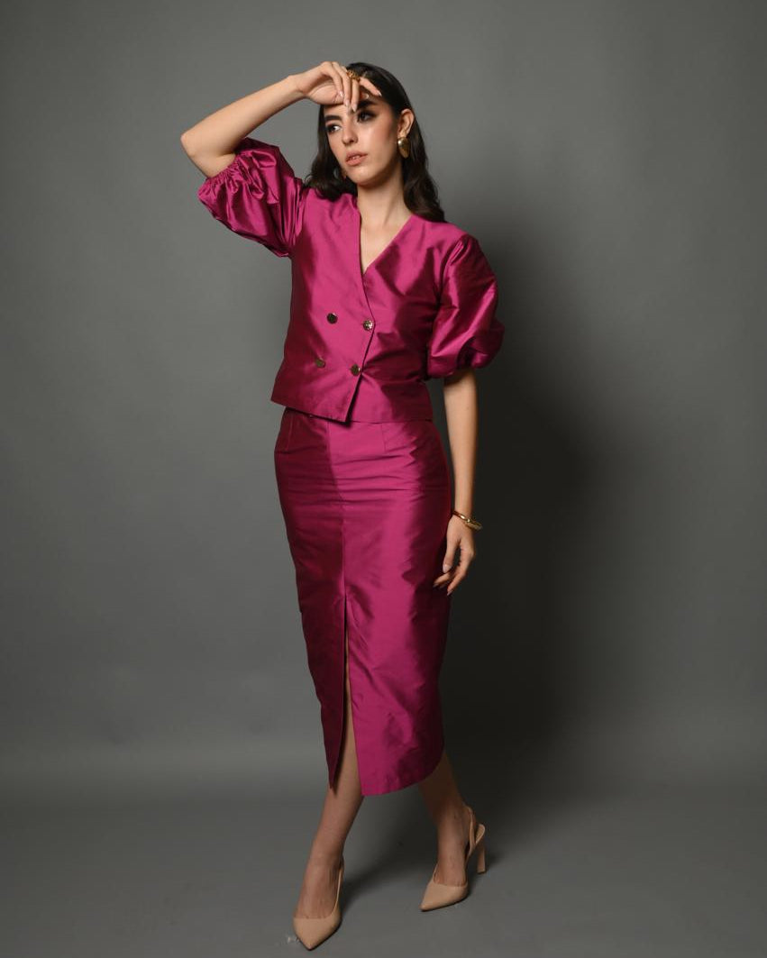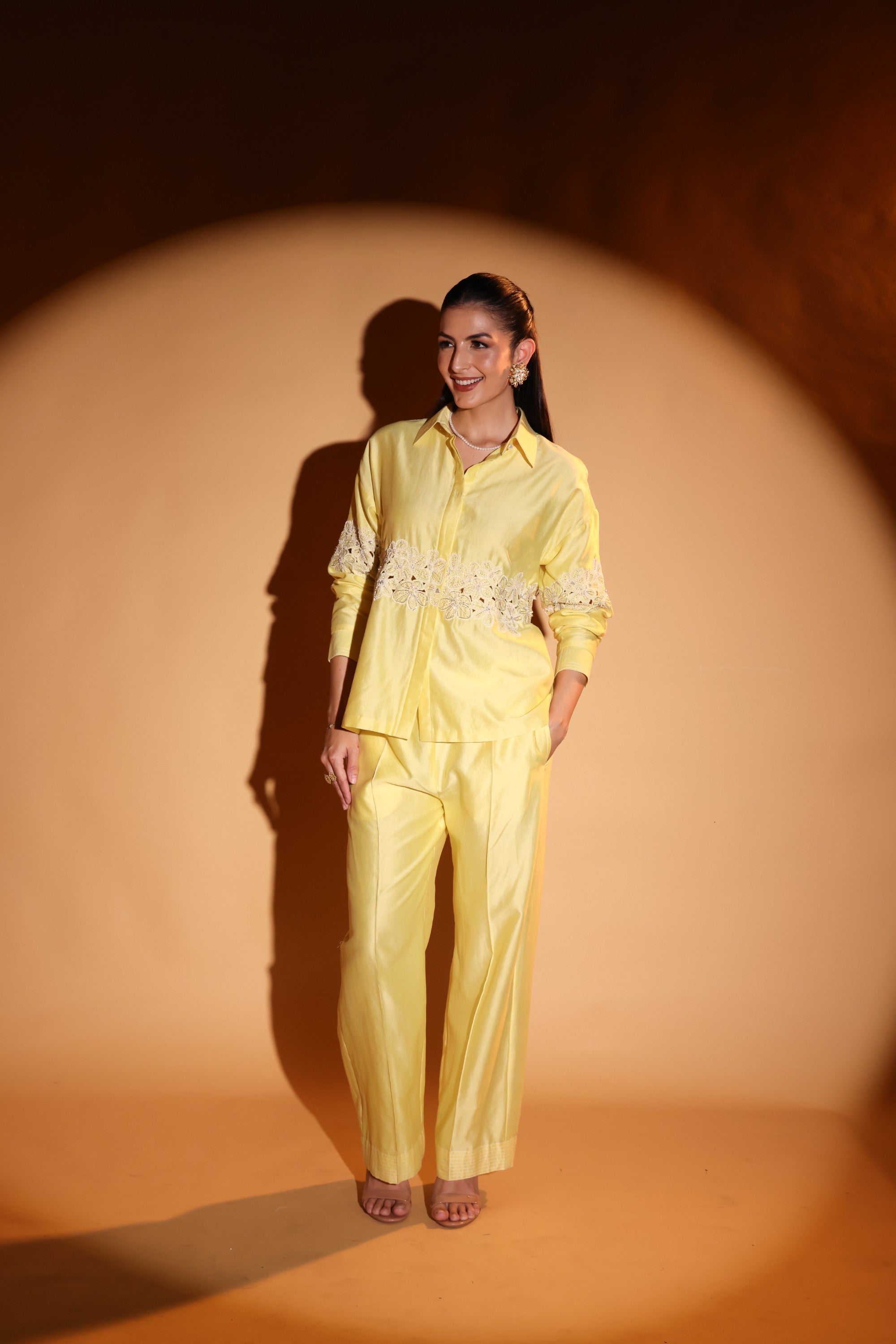 Bring the sunshine with SUNFLOWER, crafted in luminous butter-yellow Chanderi. The embroidered floral cutwork with pearl detailing across the waist and sleeves adds a delicate charm, while the relaxed silhouette keeps it modern and effortless. A vibrant statement for daytime festivities and beyond.