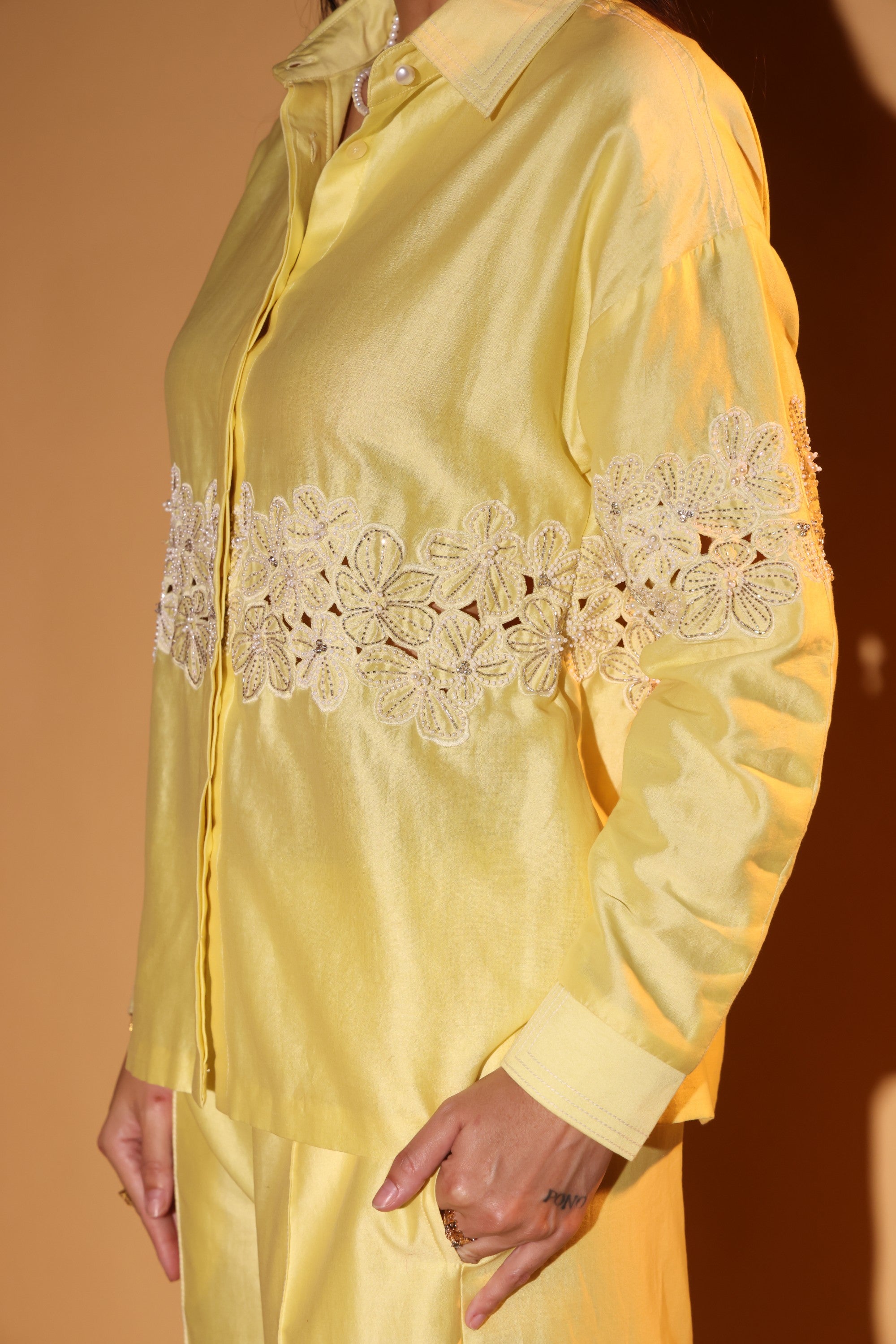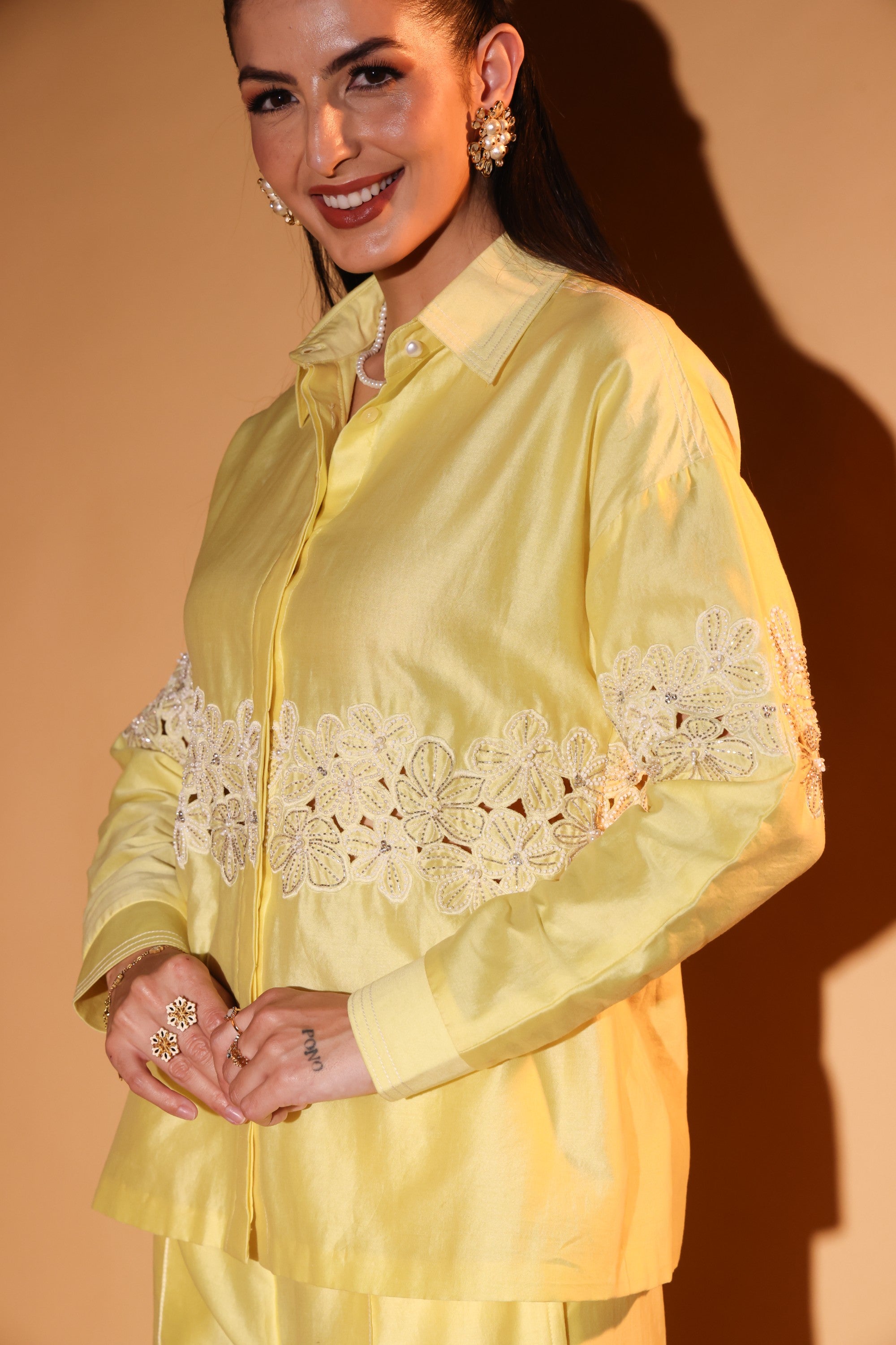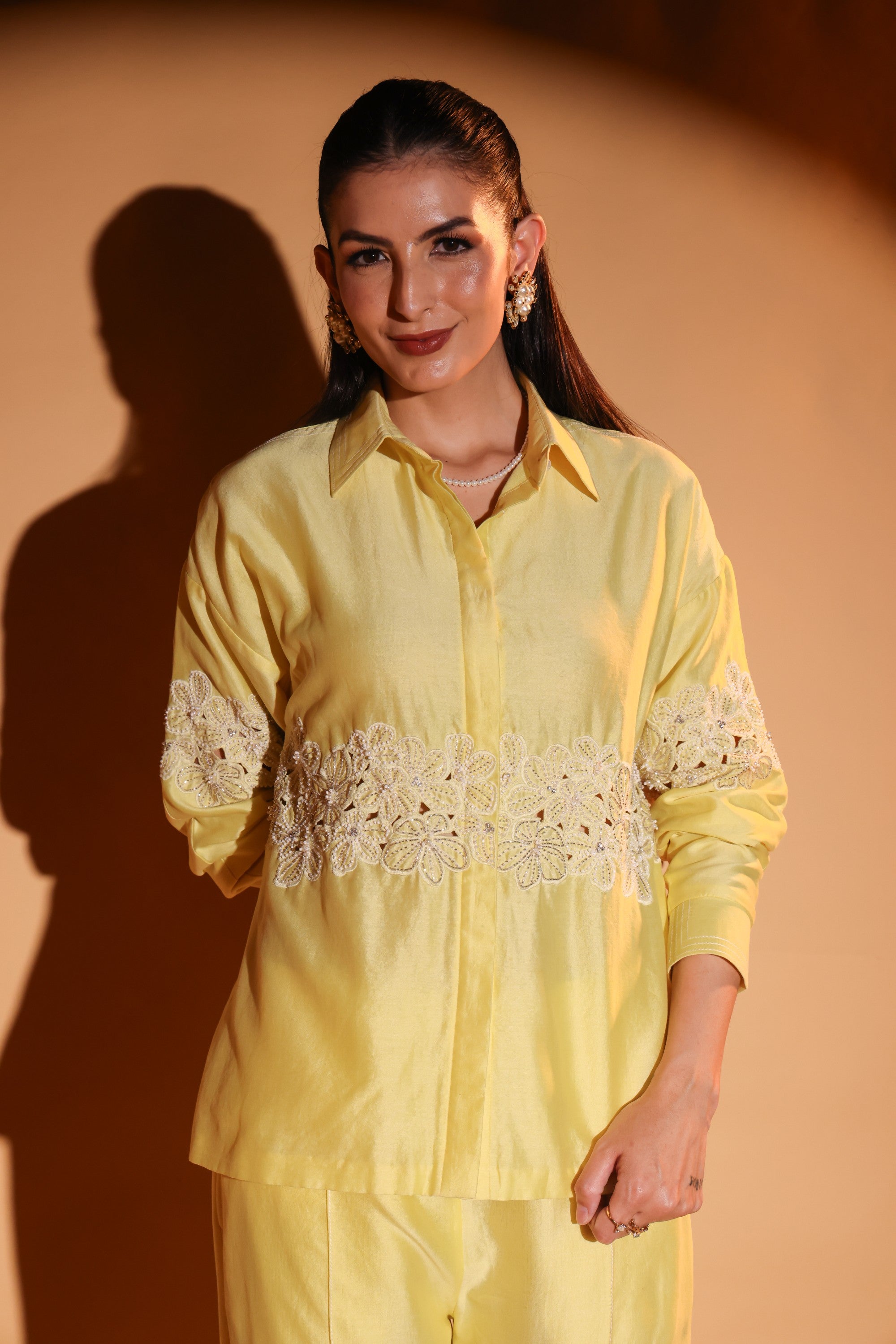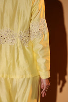 Bring the sunshine with SUNFLOWER, crafted in luminous butter-yellow Chanderi. The embroidered floral cutwork with pearl detailing across the waist and sleeves adds a delicate charm, while the relaxed silhouette keeps it modern and effortless. A vibrant statement for daytime festivities and beyond.