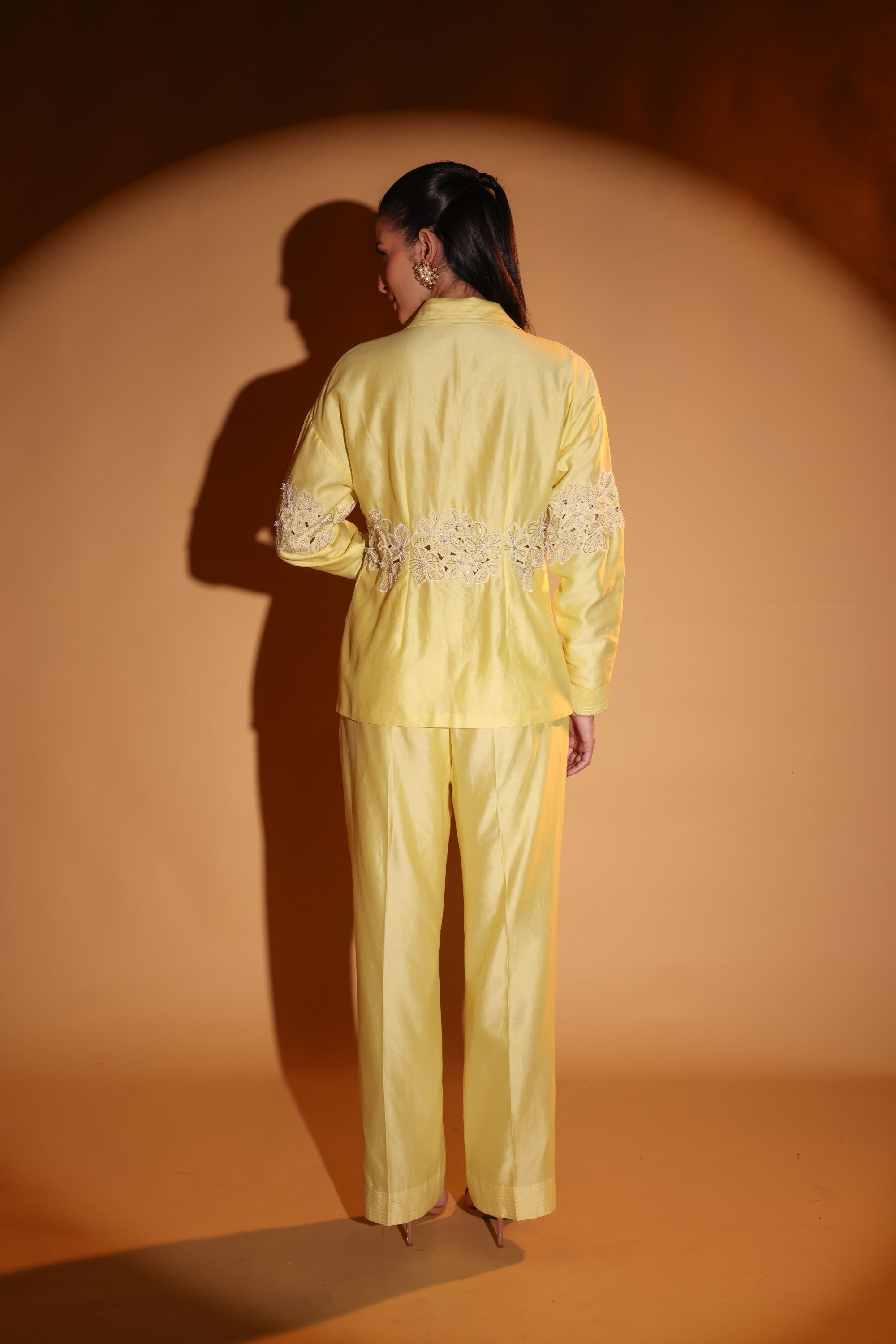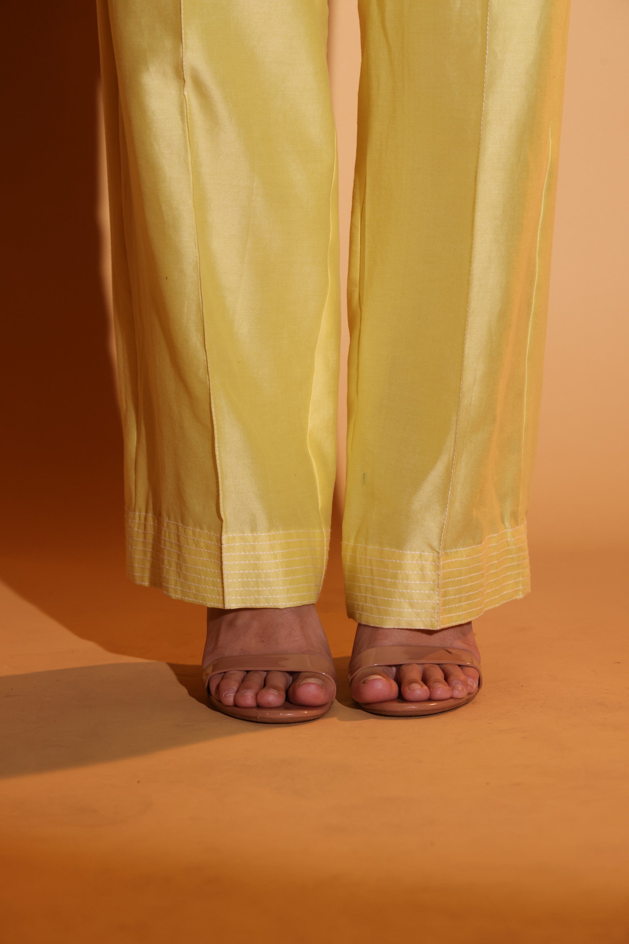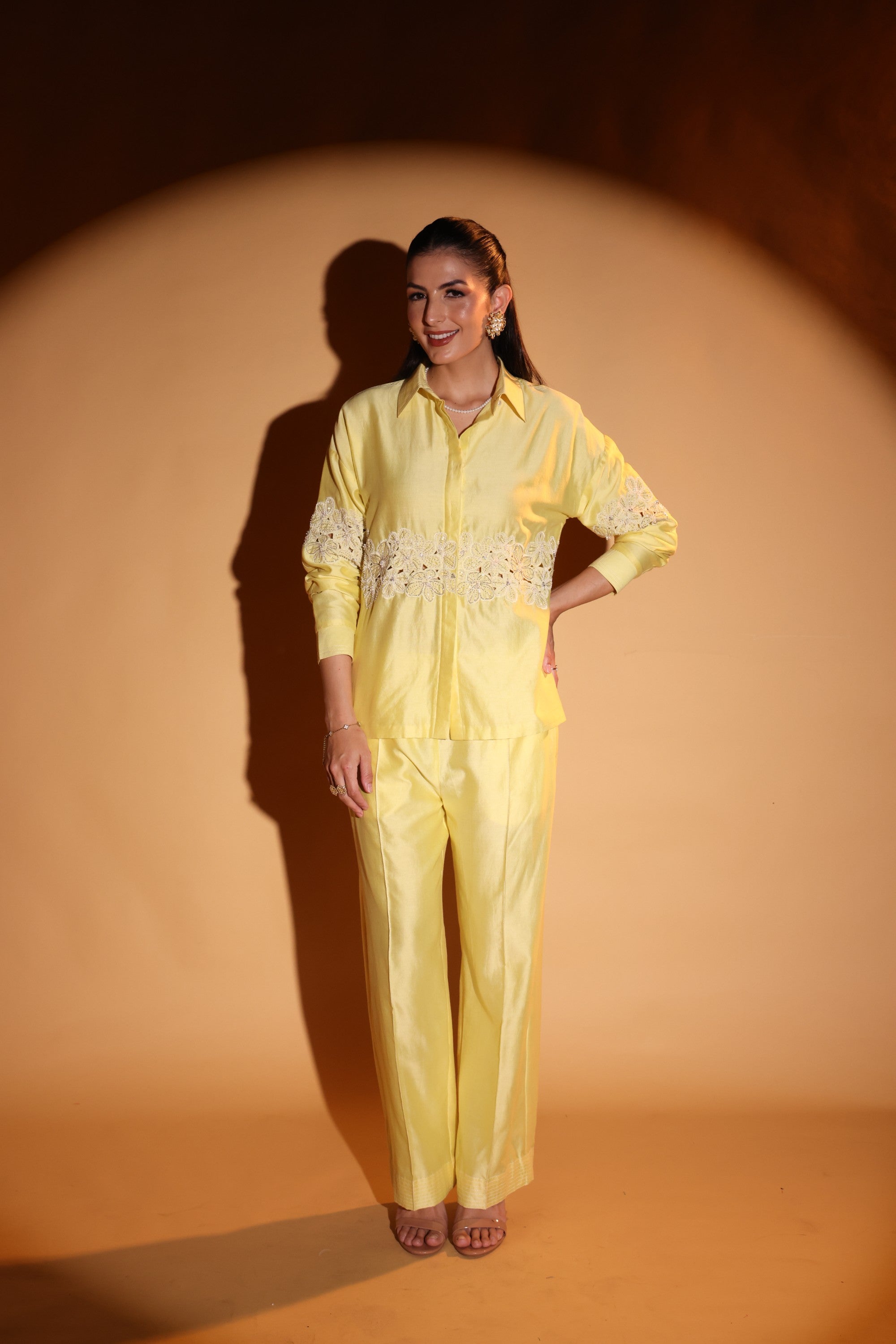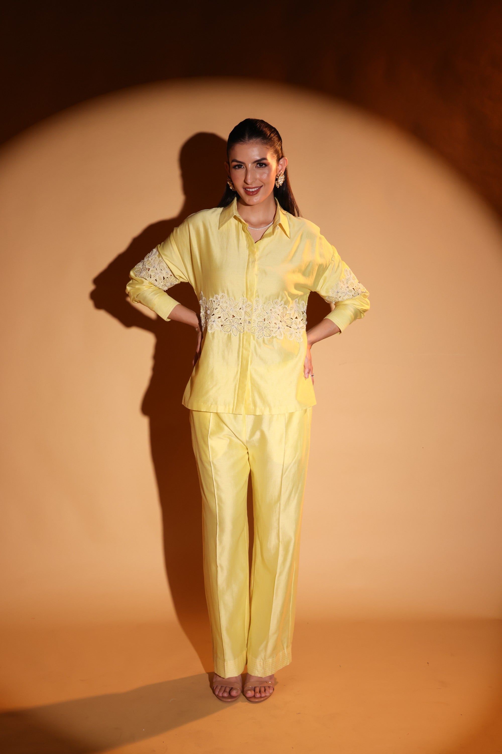 Bring the sunshine with SUNFLOWER, crafted in luminous butter-yellow Chanderi. The embroidered floral cutwork with pearl detailing across the waist and sleeves adds a delicate charm, while the relaxed silhouette keeps it modern and effortless. A vibrant statement for daytime festivities and beyond.