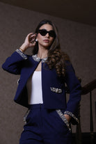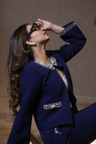 A chic statement layer defined by modern tailoring and exquisite pearl artistry. This cropped navy jacket features hand-embellished pearl and crystal detailing along the collar, cuffs, and pocket flaps