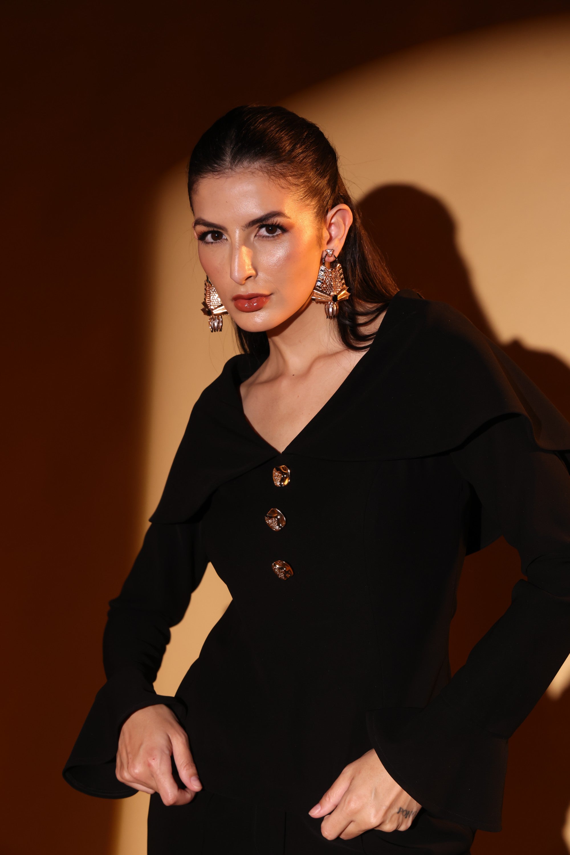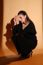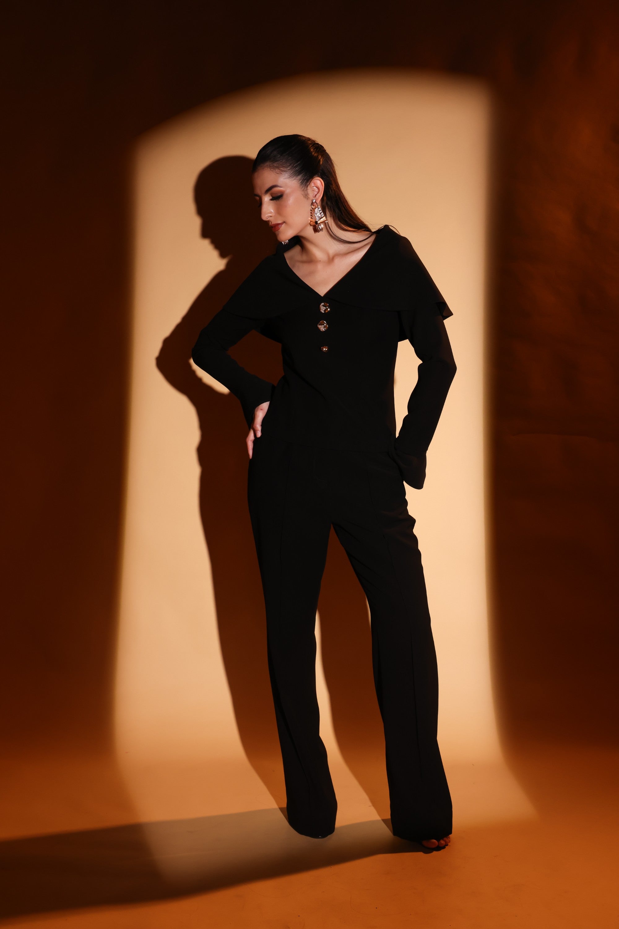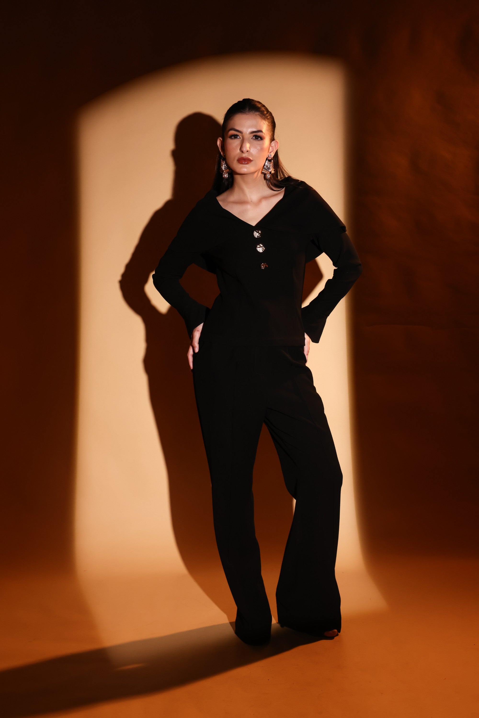 Designed to command the room, this all-black co-ord features a dramatic draped neckline that frames the shoulders, statement gold buttons and bell bottom pants.