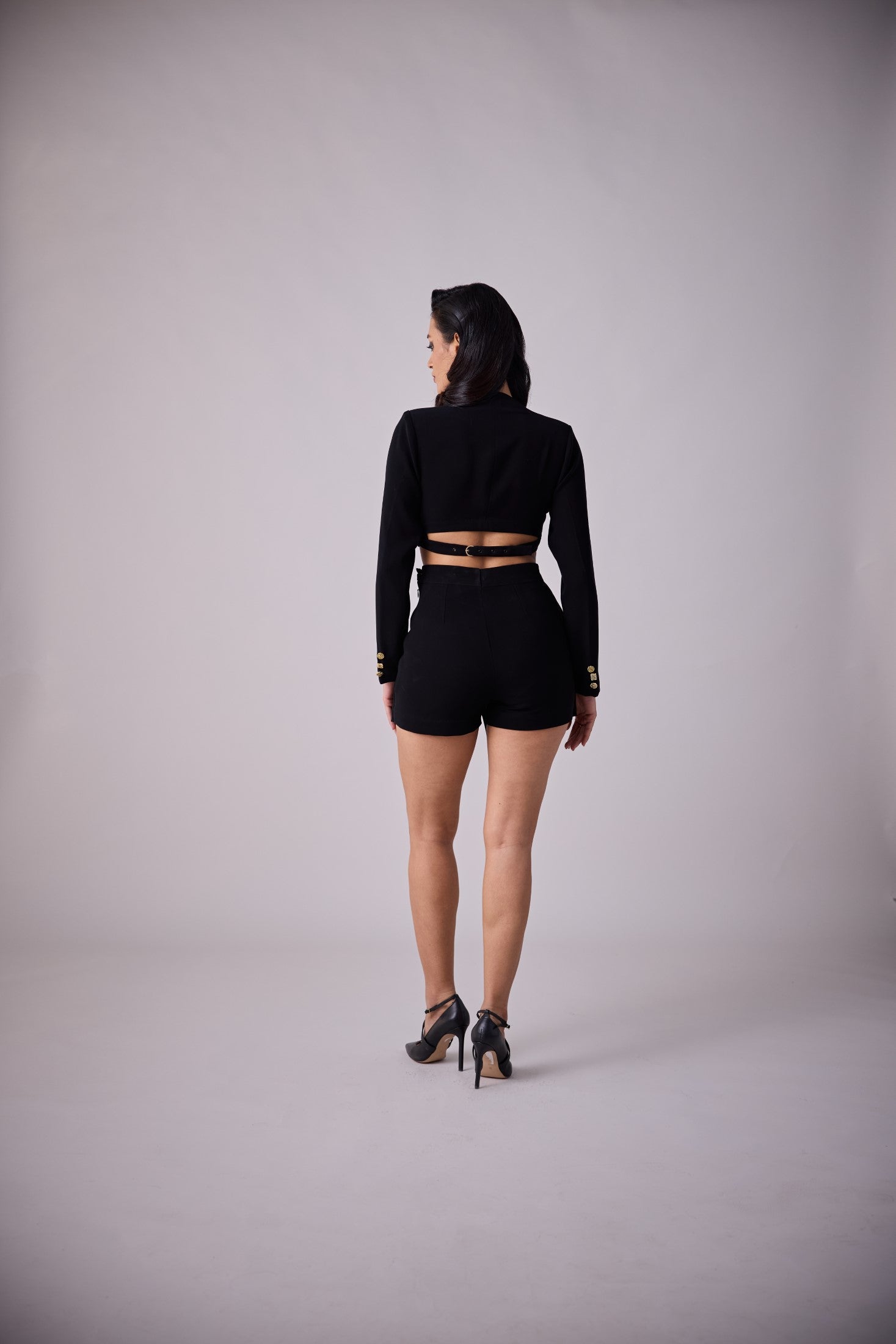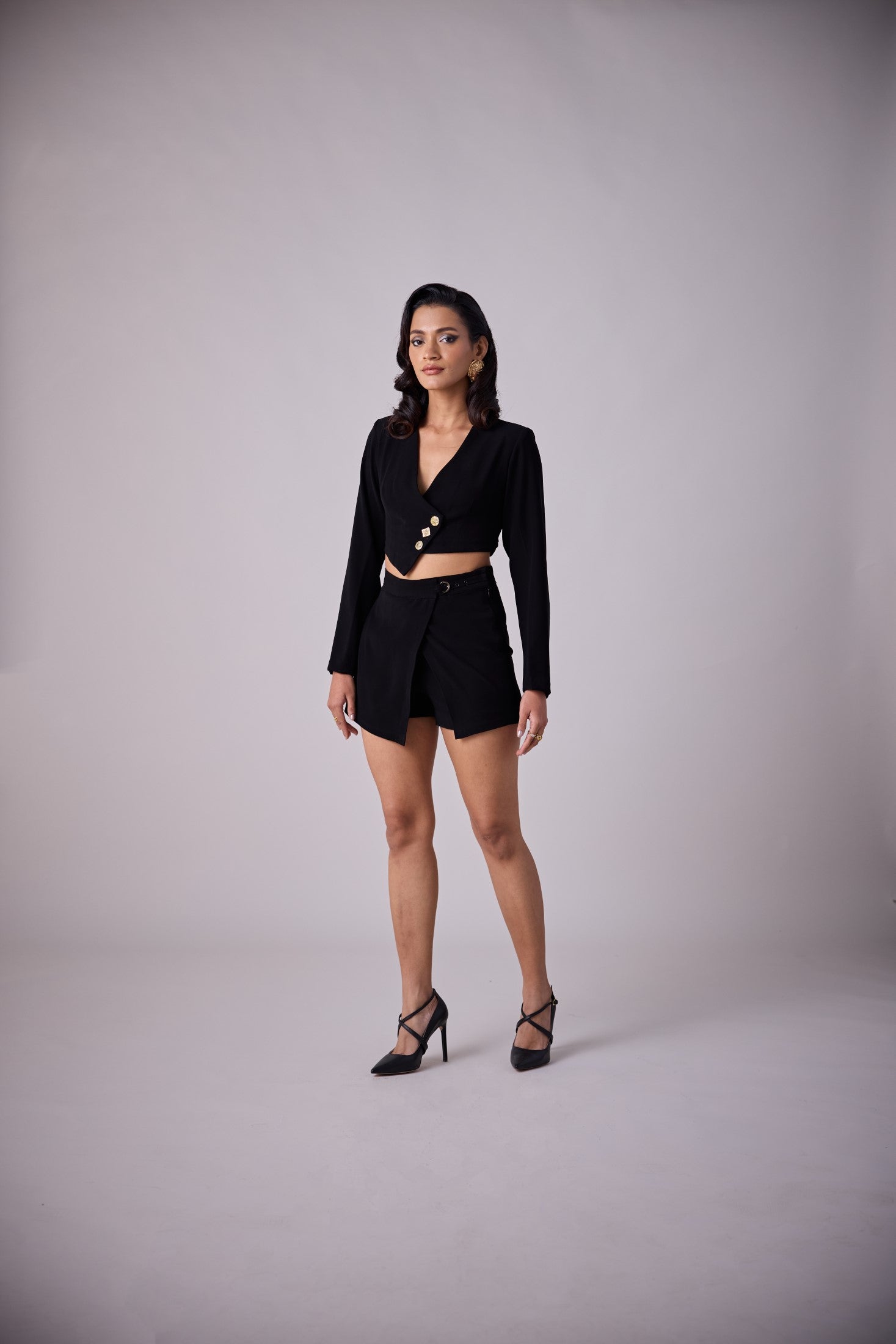 ABBA is a fitted tailored skort set, crafted from our exclusive black crepe fabric featuring a single-breasted waistcoat with goldbutton fastenings. Pair with the ABBA Skort to complete the look.