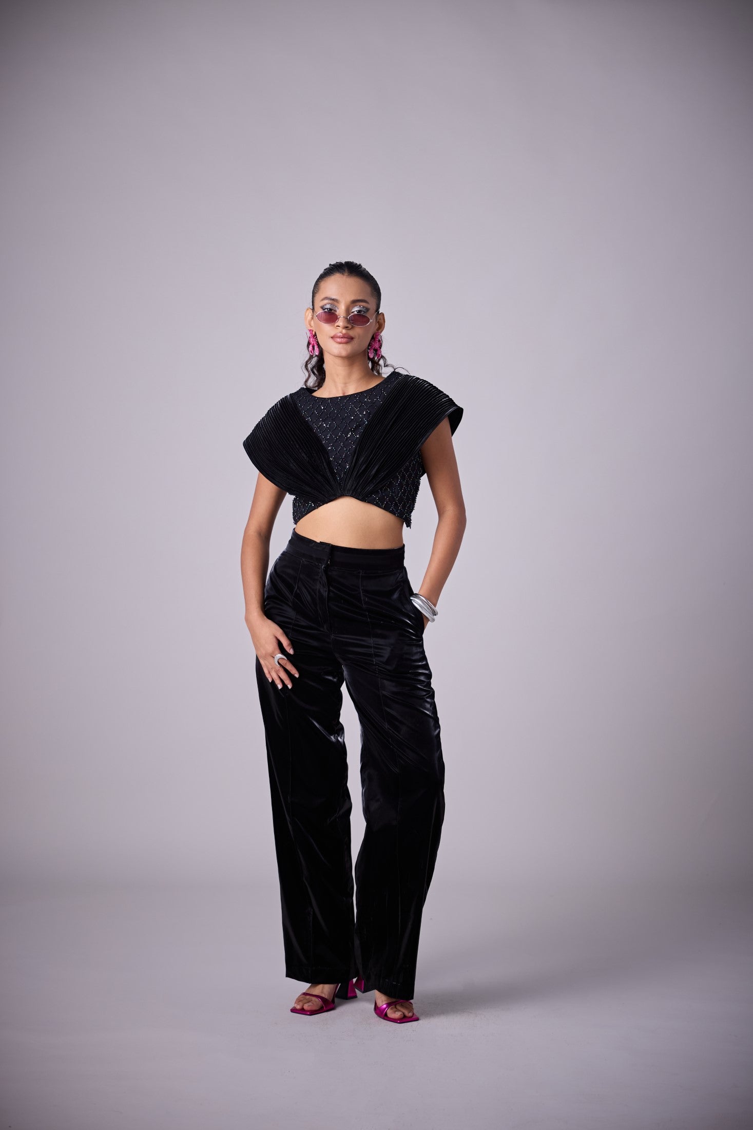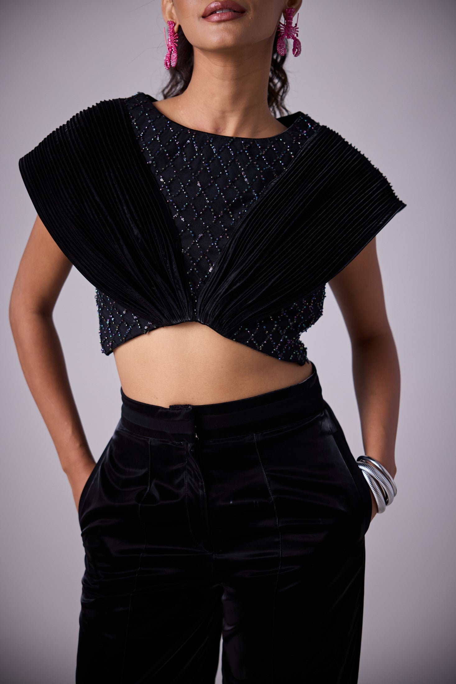 Go for glamour in ALETTI. The top features an assymmetric hemline to give a sleak waistline and pin tucked panels to give an extention to your shoulder extruding power and play at the same time.