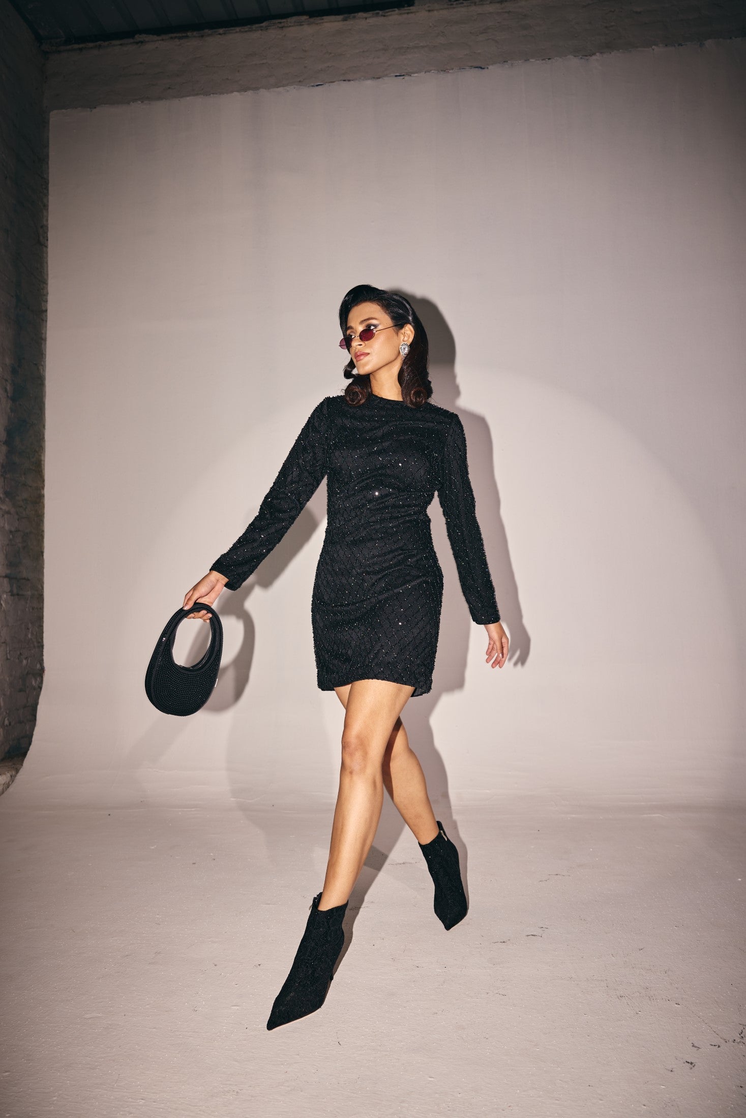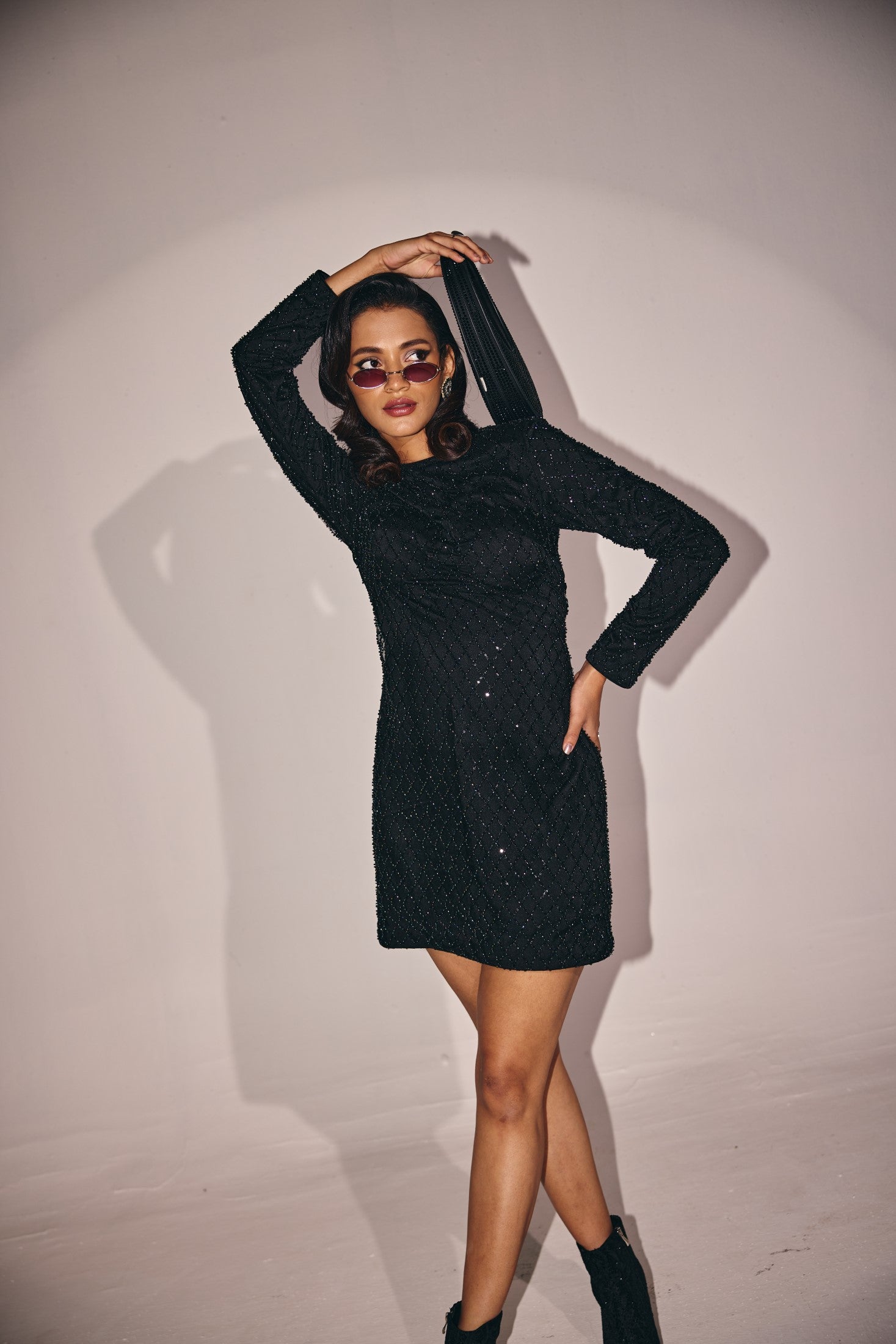 Make a statement at any occasion with CHARLOTTE. The calf length dress made from our striking multicolored black crystal grid boasts a deep back held with buckled straps and is guaranteed to make all heads turn.