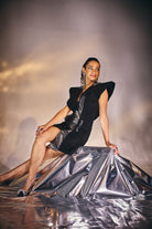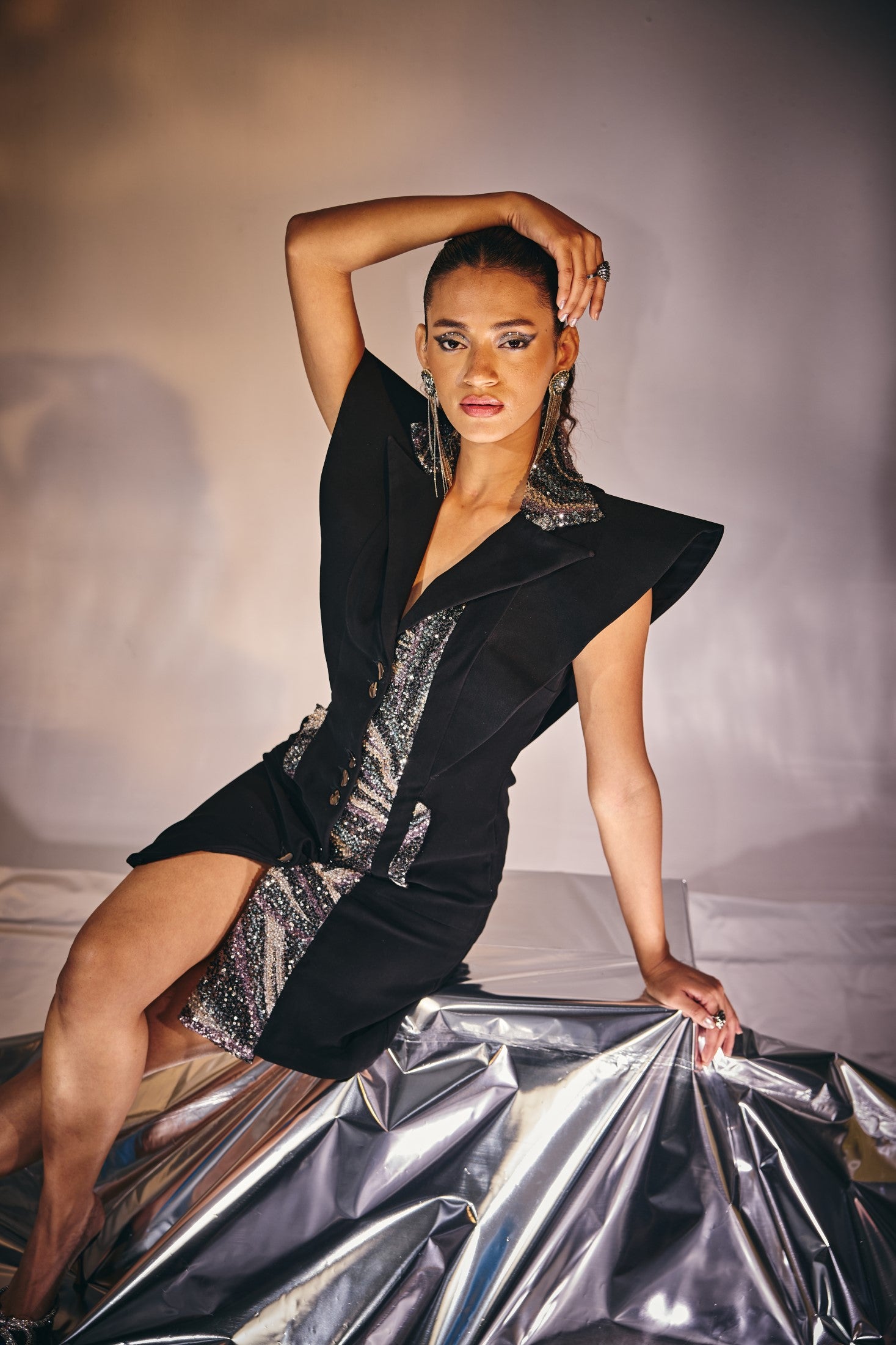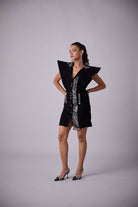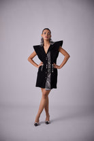 Prepare to look spotlessly chic when dressed in CHER. This highly sophisticated structured blazer dress features a plunging neckline and beaded power shoulders with an embellished collar and pocket bone.