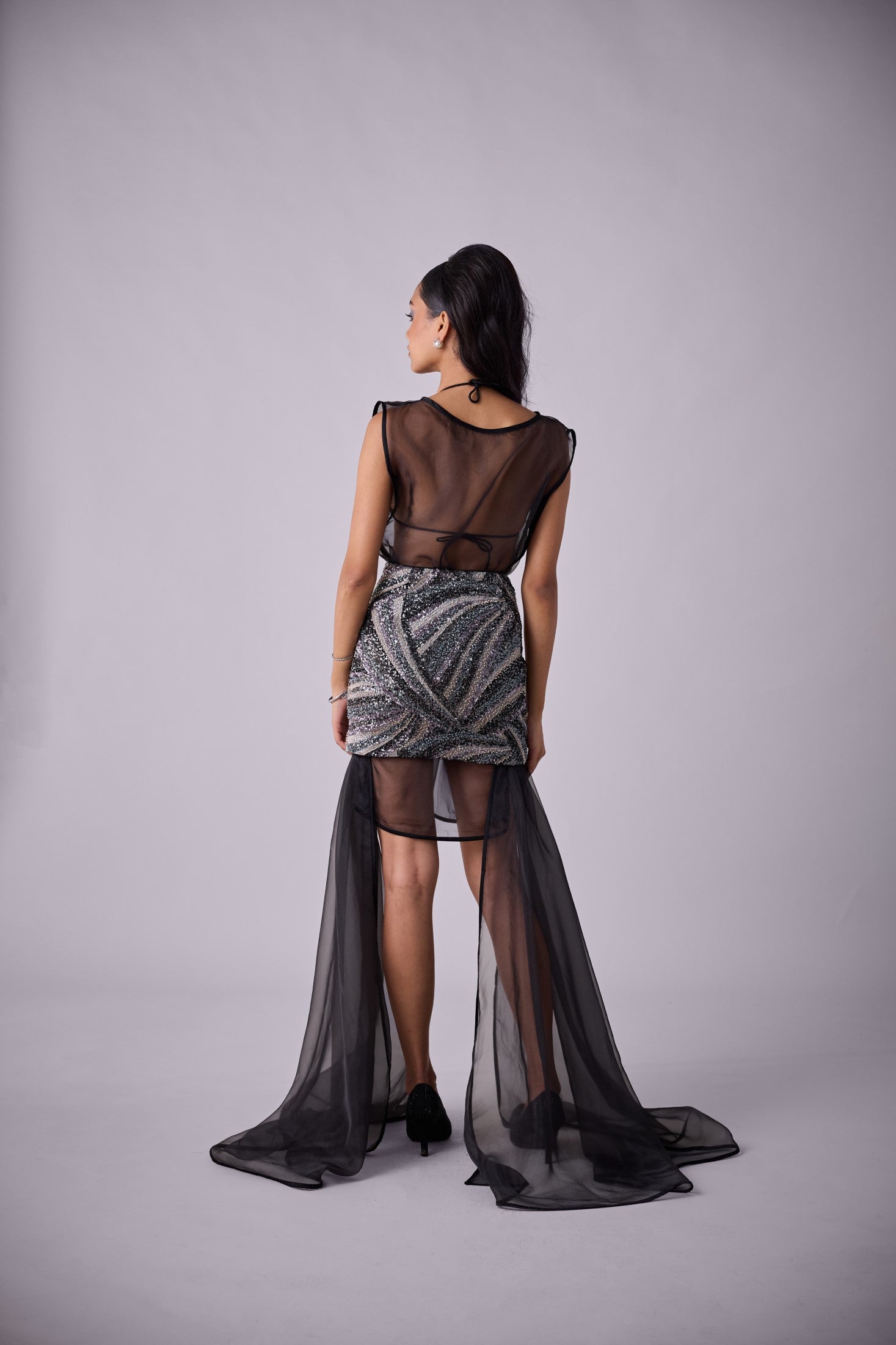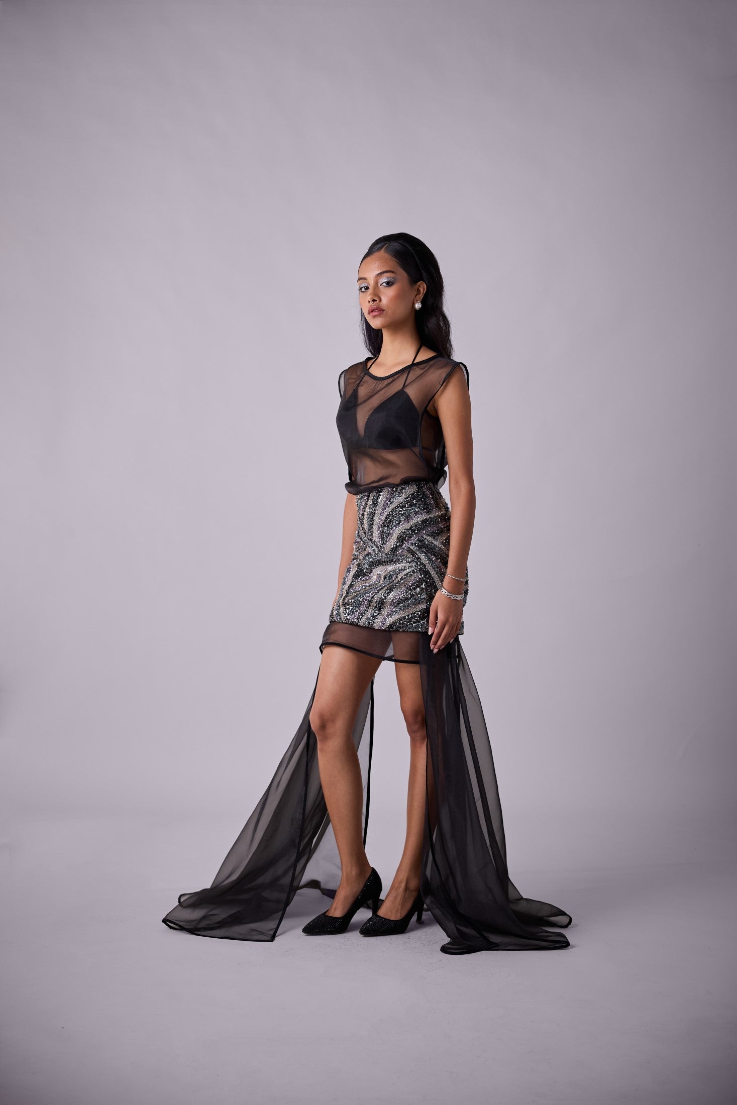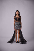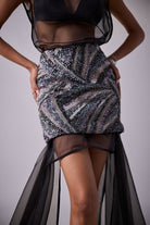 Meet GLORIA; a luxurious coverall paired with our KIRA skirt. This heavily sequined embroidered skirt worn over contours to the body and hugs in all the right places.