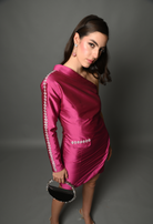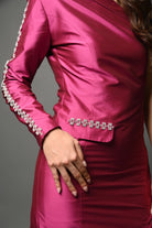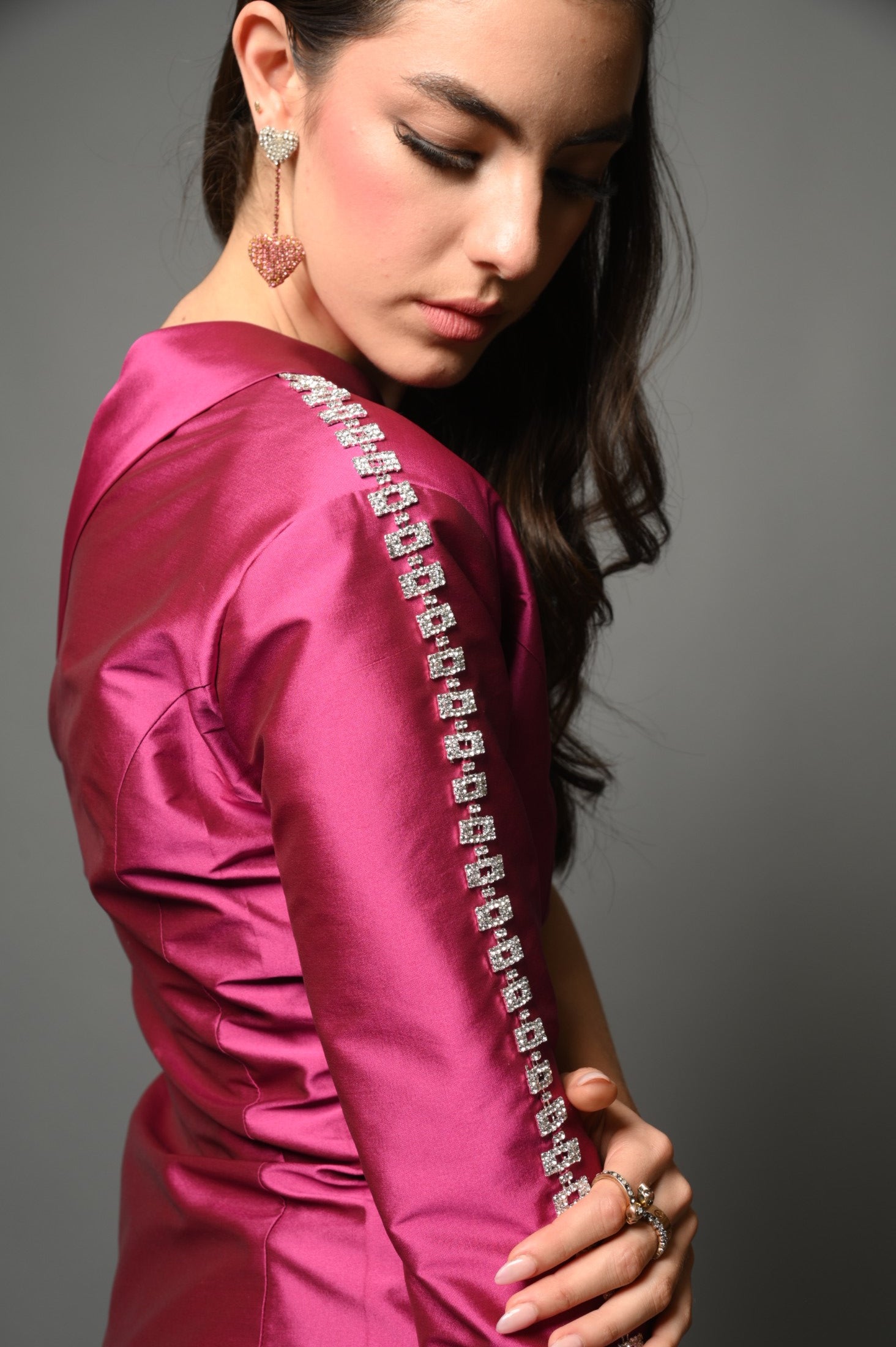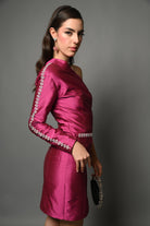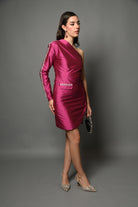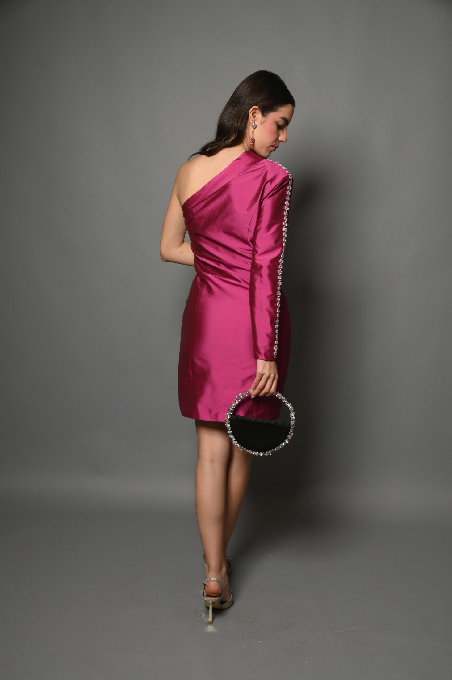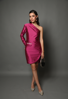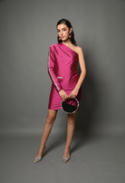 Make a statement at any occasion with ELSA Dress. An opulent design crafted for endless celebration. This luxurious dress boasts a one shoulder lapel sleeve with a striking jewel-embellished trim, enhanced by shoulder pads.