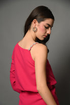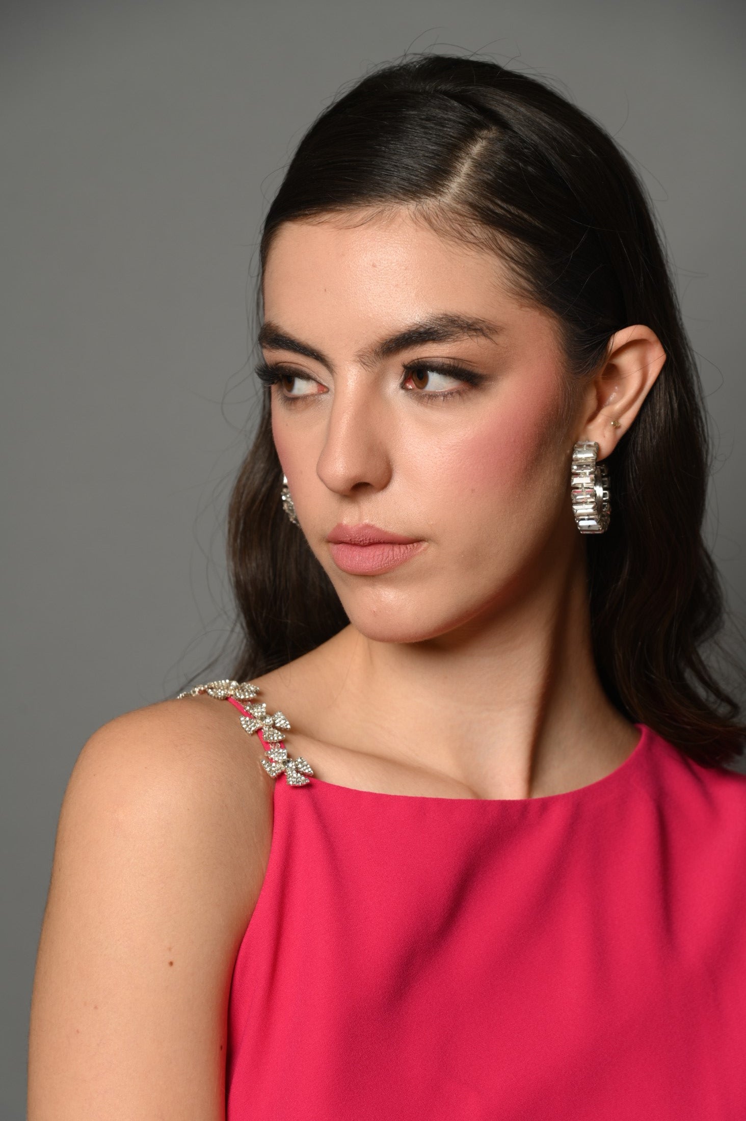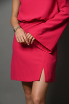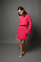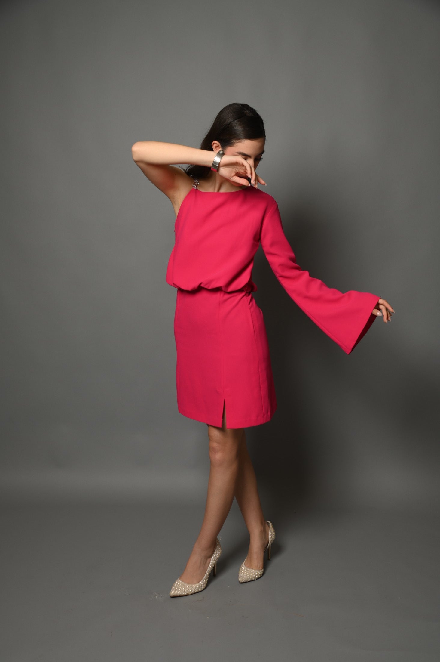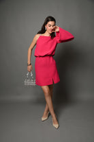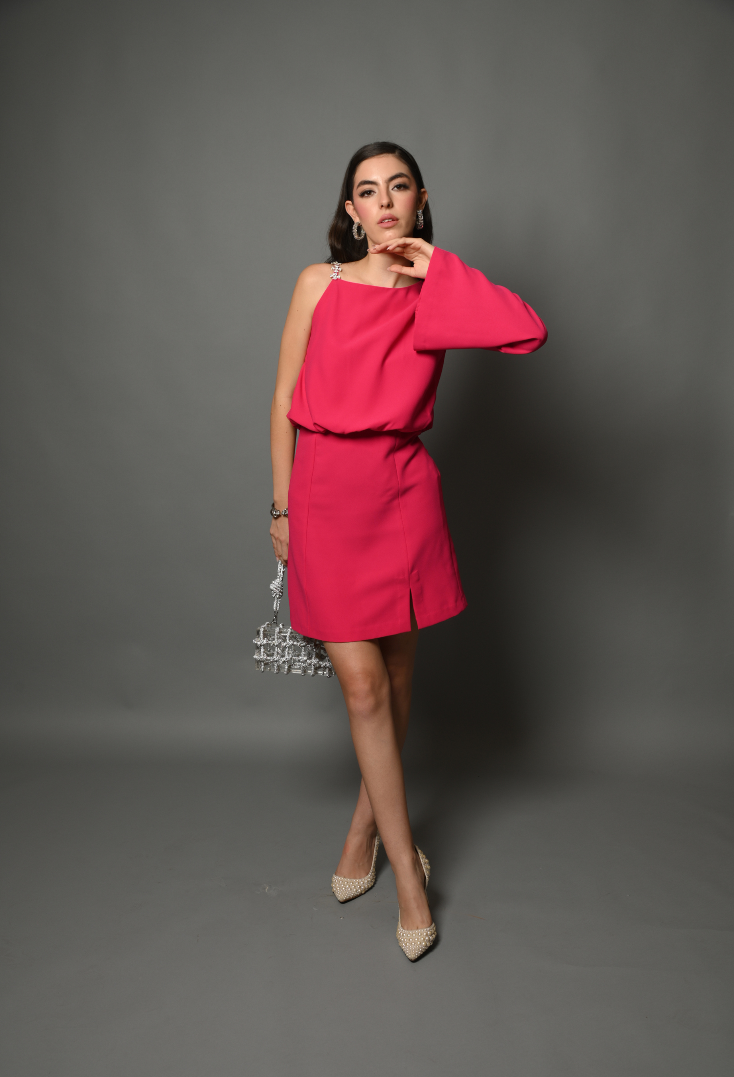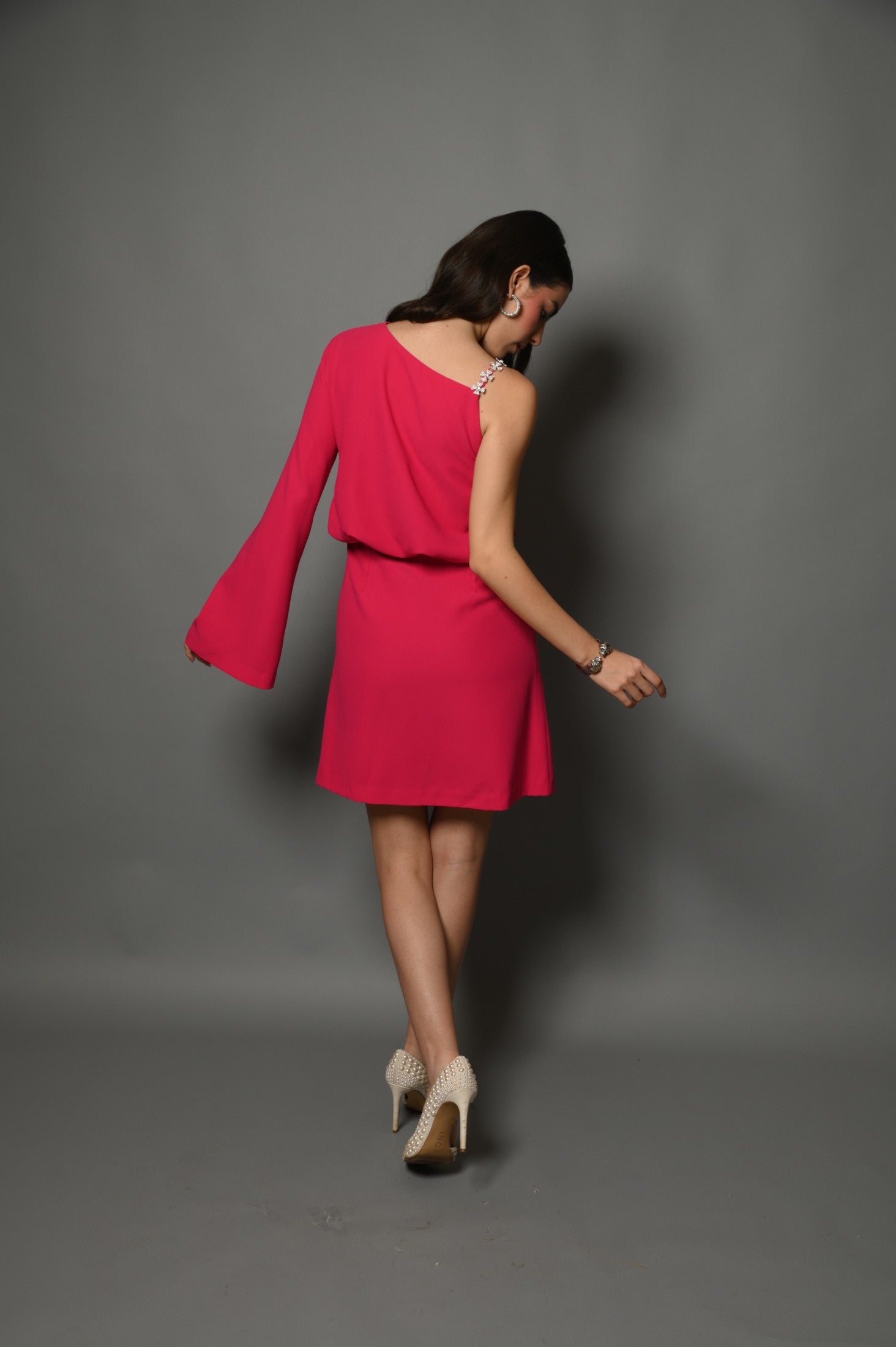 Take strides in our SUGAR Hot Pink Dress. This statement dress is designed from our exclusive crepe fabric featuring a bejwelled one shoulders strap and bell sleeves. FInished with a cut out split to the front hemline for a sleek finish.