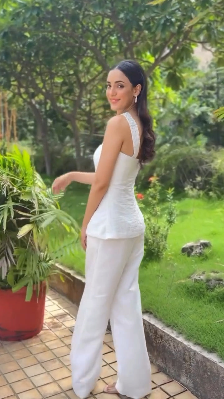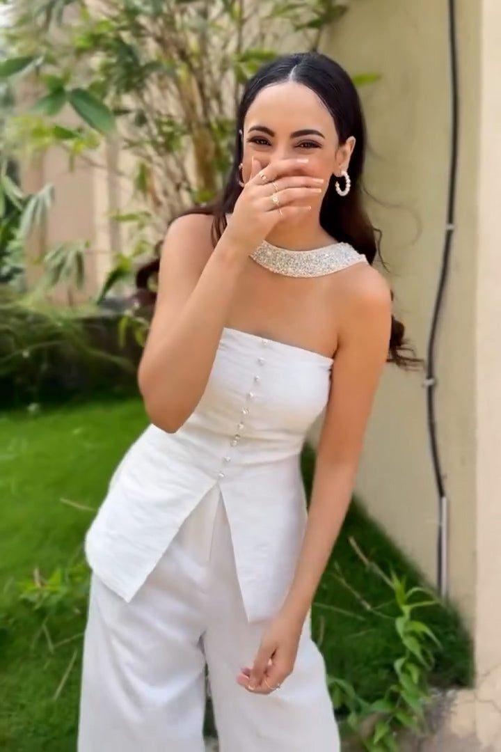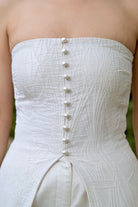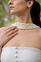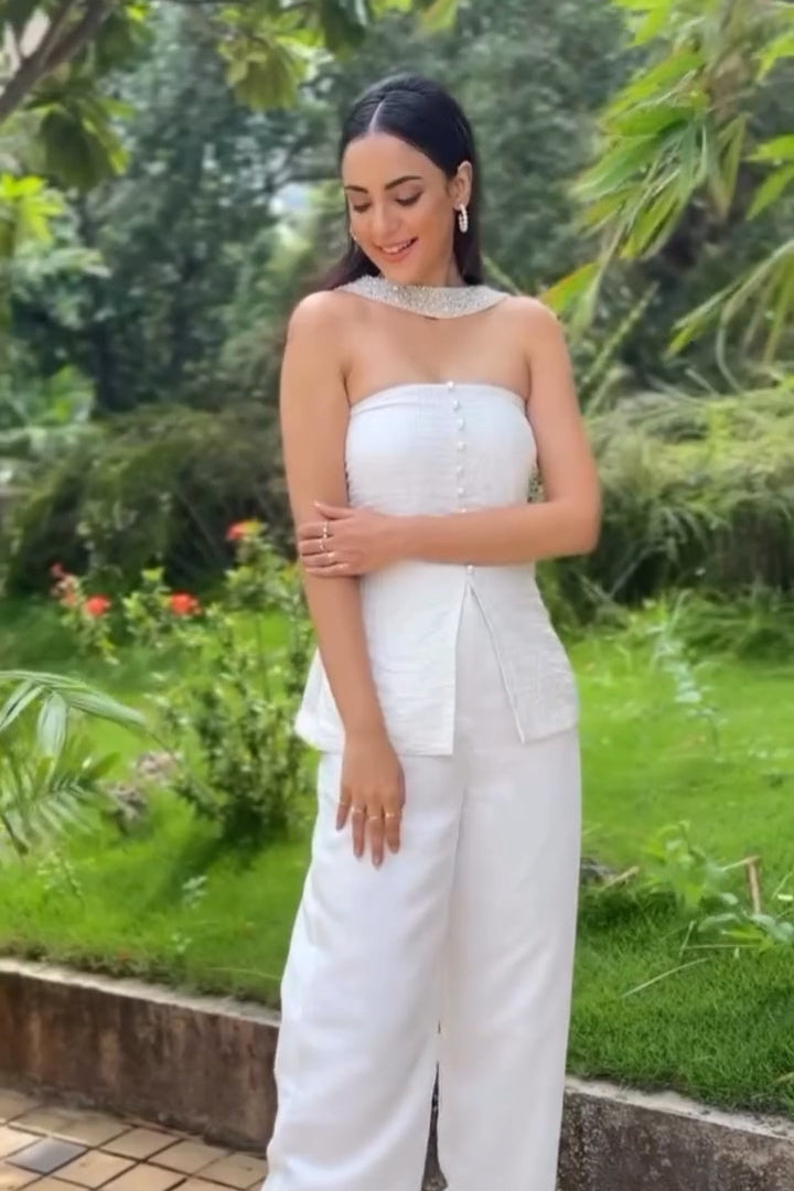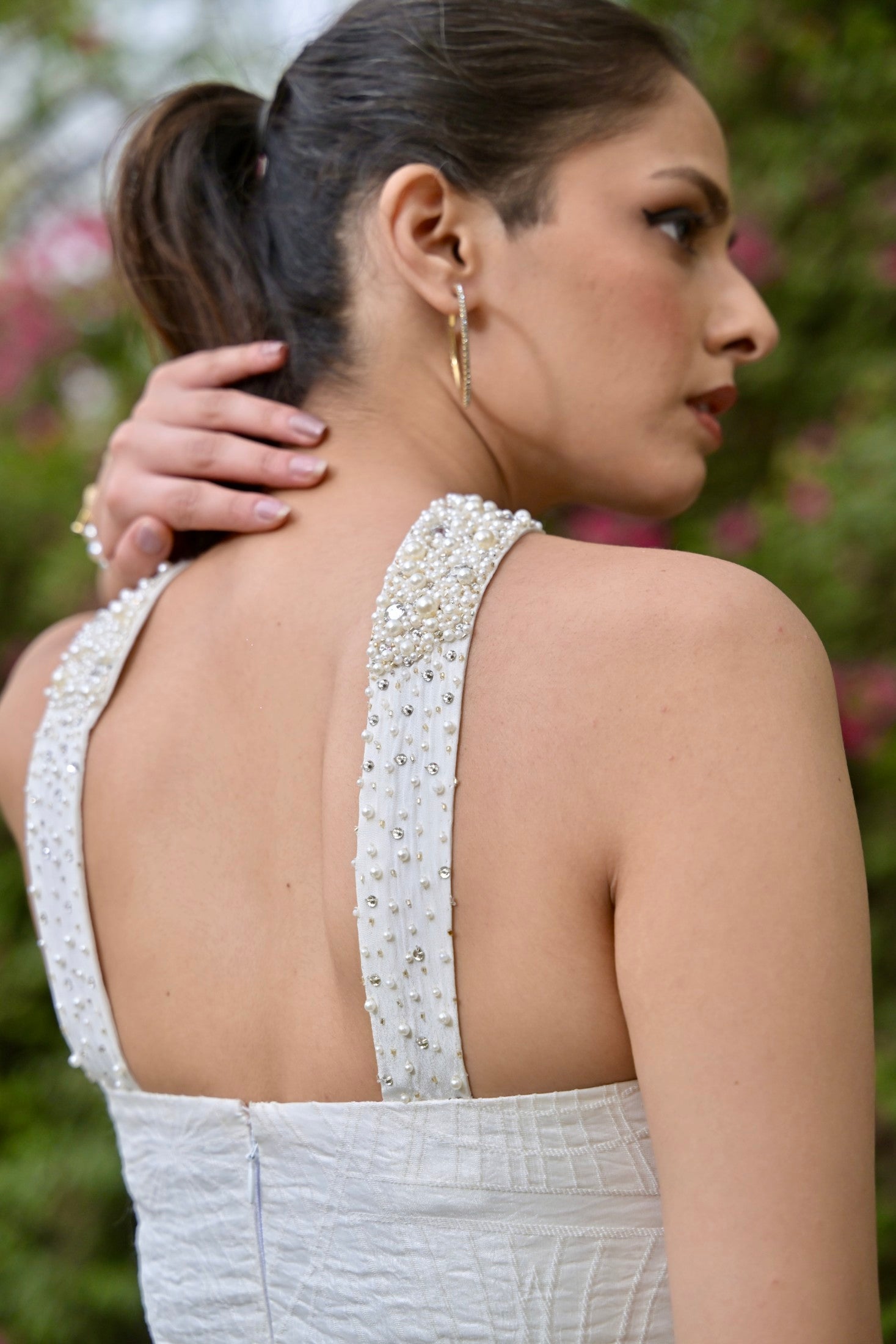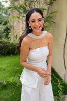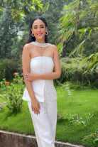 Unveil your glamorous side with BIANCA WHITE. A dazzling embodiment of luxury. This lightweight jacquard top showcases a straight neckline, along with jewelled pear; diamanté straps and is completed with an invisible zipper at the back, ensuring a polished finish. This piece comes with elegant trousers crafted in our exclusive banarsi fabric.