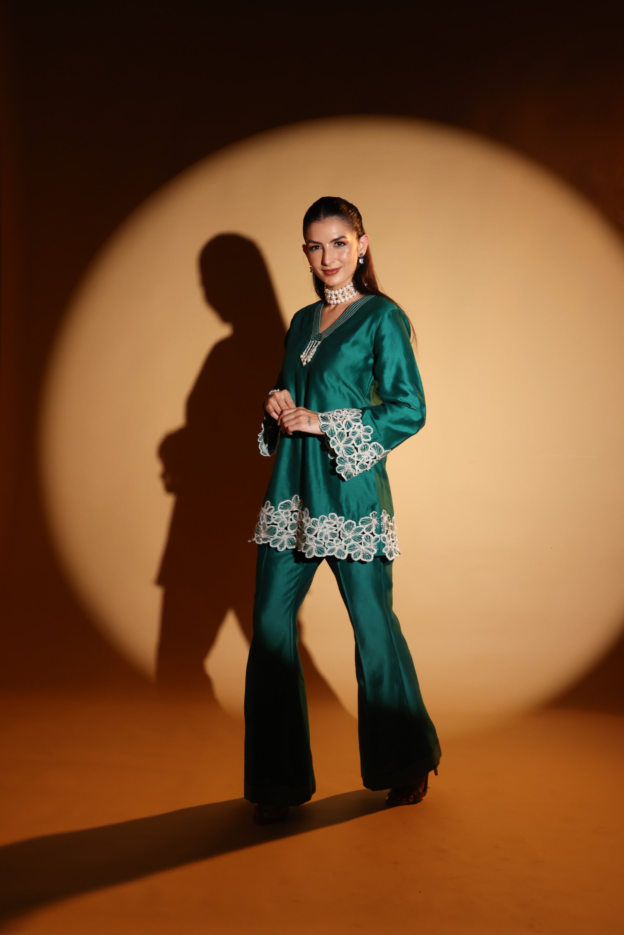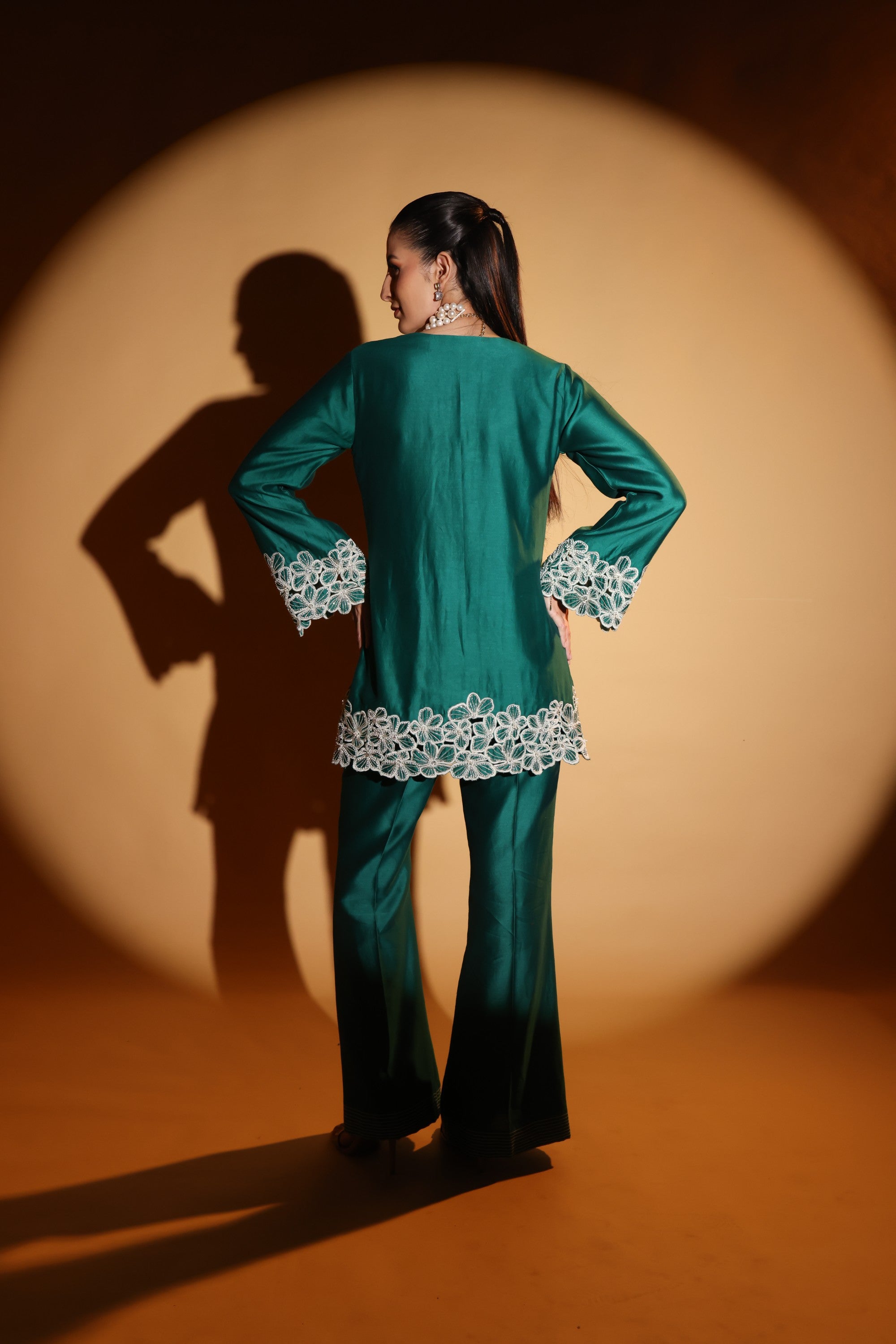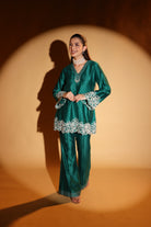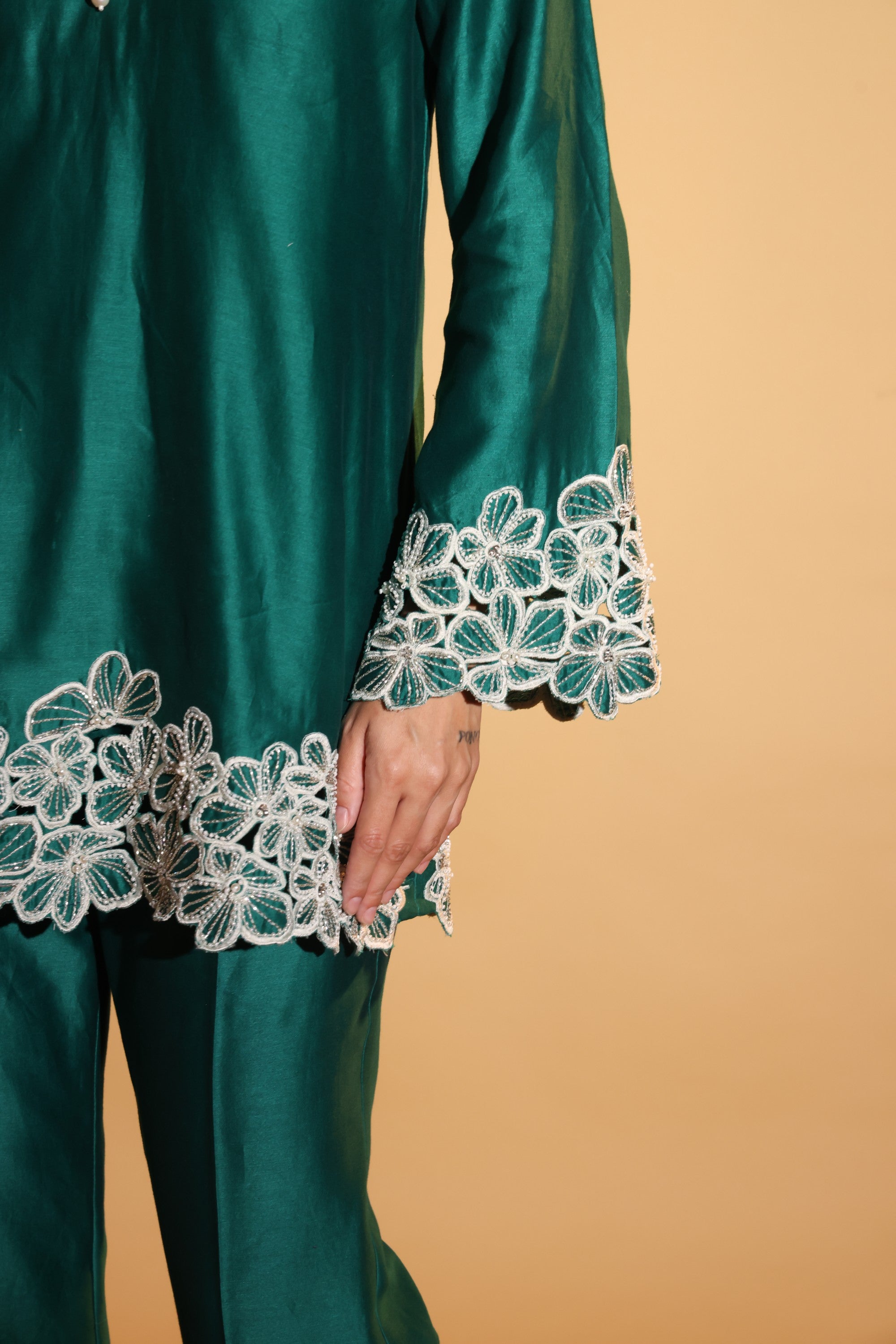 Drape yourself in emerald elegance with DAISY- an emerald set crafted in luminous Chanderi with intricate floral embroidery at the cuffs and hem. The fluid kurta and tailored trousers create a sleek silhouette, while pearl accents elevate its festive charm.