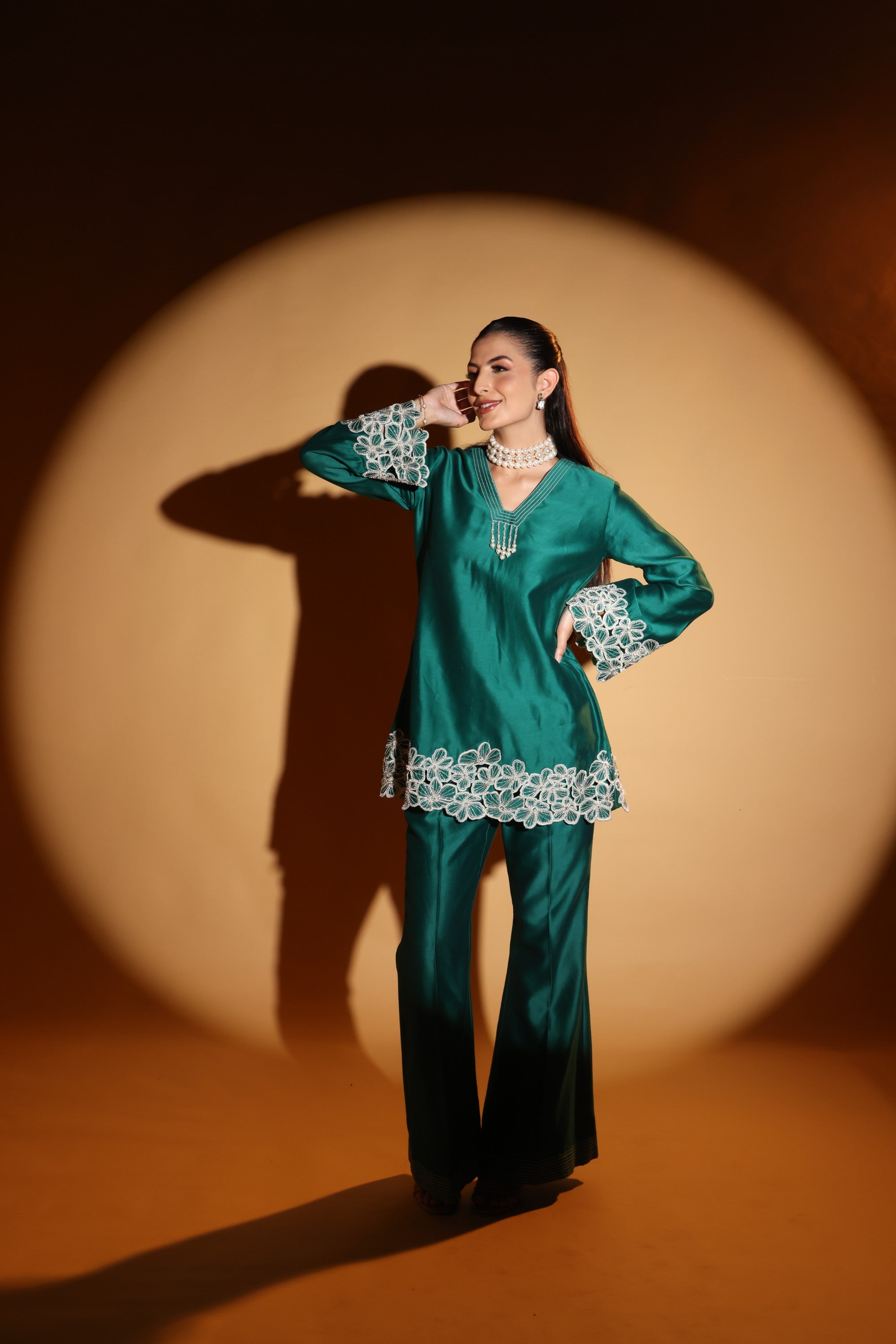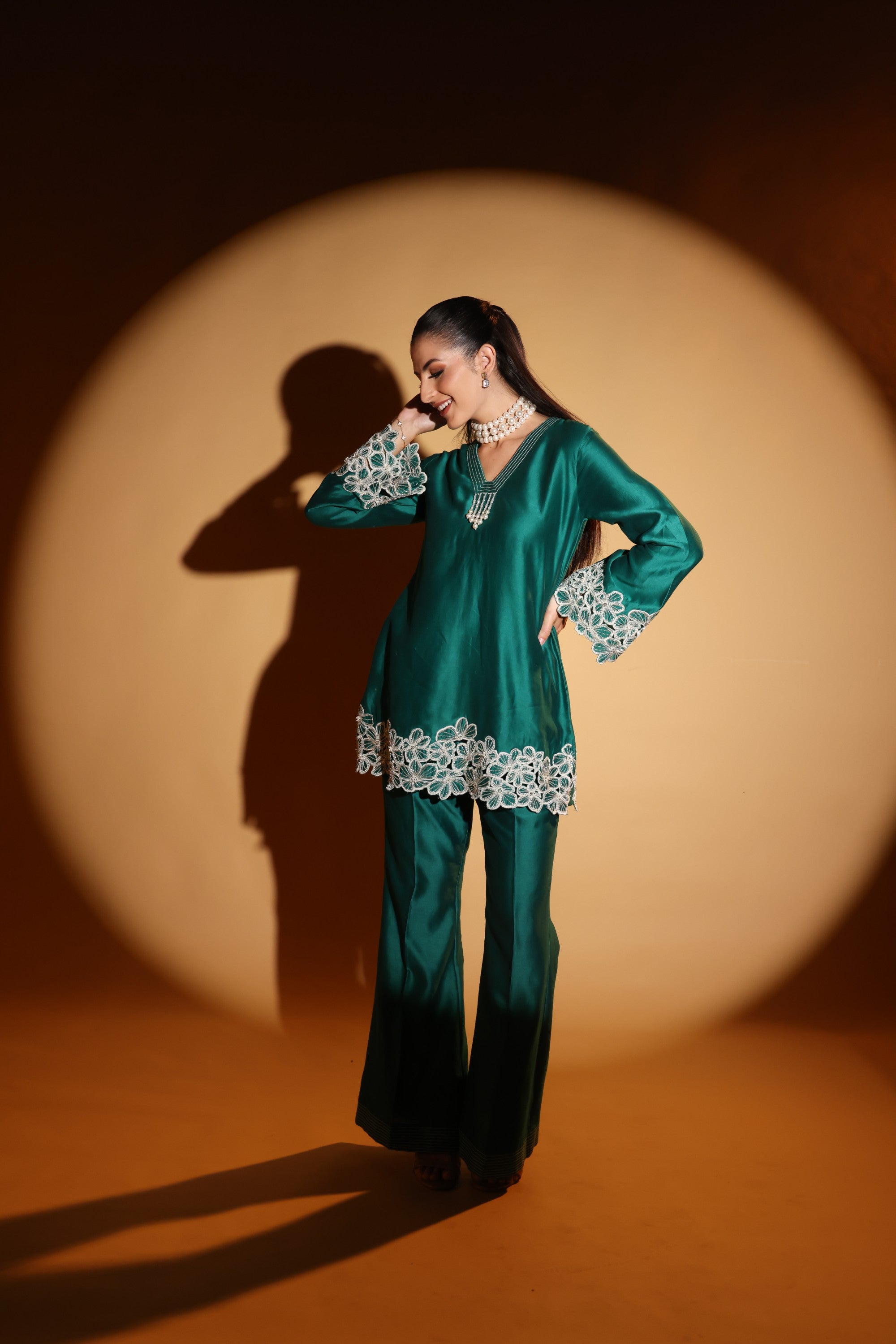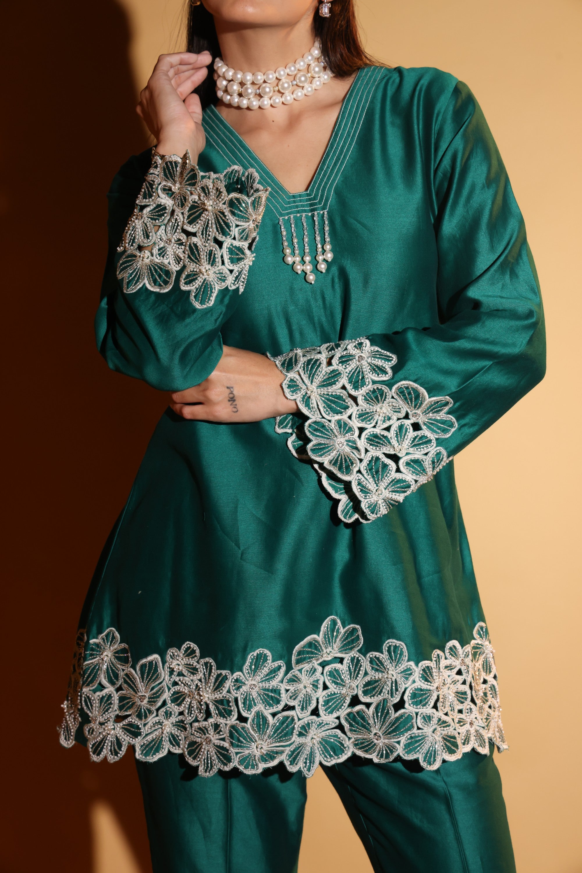 Drape yourself in emerald elegance with DAISY- an emerald set crafted in luminous Chanderi with intricate floral embroidery at the cuffs and hem. The fluid kurta and tailored trousers create a sleek silhouette, while pearl accents elevate its festive charm.