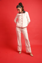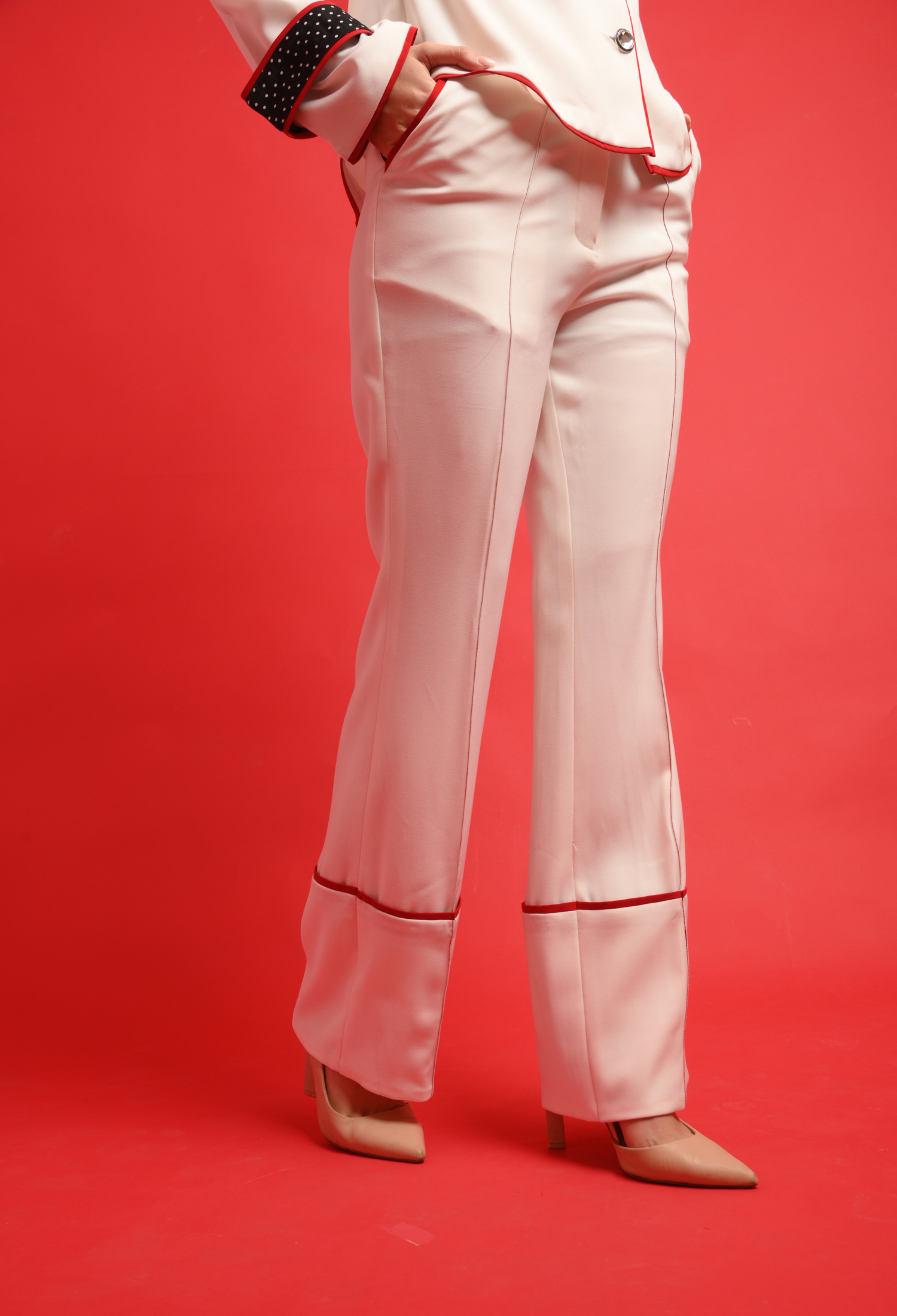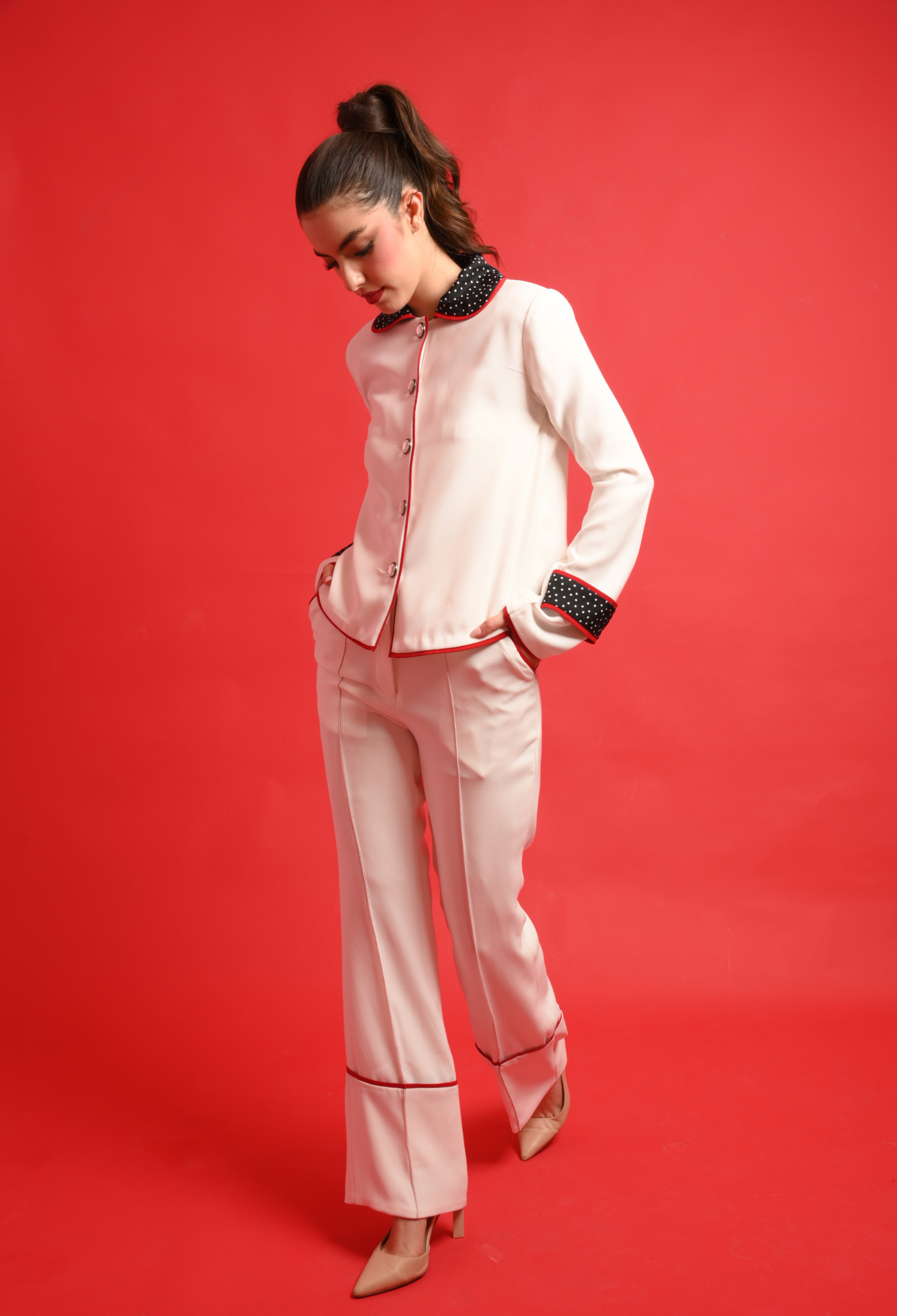 The KELLY White Trousers are the perfect piece for those daring to make a statement. Made from our exclusive crepe and enhanced with polka accents. Why not pair with our matching SIMP White Jacket Top to complete the look?