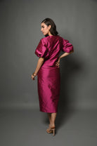 The stunning IRIS Fuschia set is a modern bridal co-ord set featuring a midi skirt and a double brested shirt. This set is perfect for formal evenings and engagement shoots, making it elegant and formal at the same time.