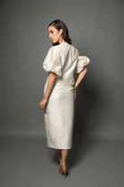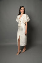 The stunning IRIS White set is a modern bridal co-ord set featuring a midi skirt and a double breasted shirt. This set is perfect for formal evenings and engagement shoots, making it elegant and formal at the same time.